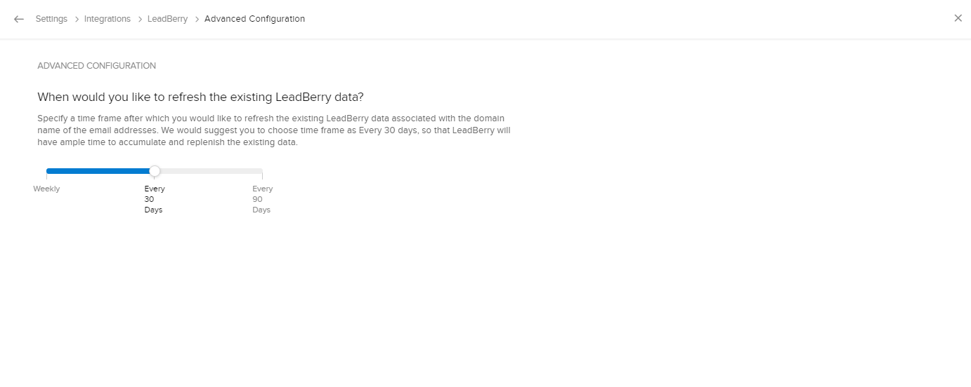 2. [高度な設定]で、Leadberryの既存のデータを更新する間隔を選択します(毎週、30日、90日のいずれか)。