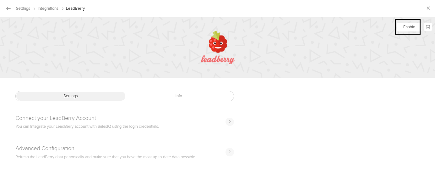 1. Zoho SalesIQの担当者画面にログインし、[設定]→[開発者向け情報]→[連携]→[Leadberry]の順に移動します。右上にある[有効にする]ボタンをクリックします。