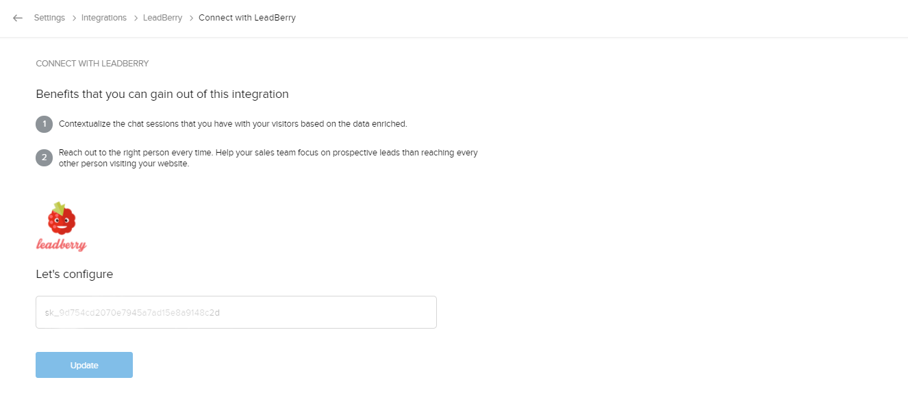 1. Zoho SalesIQアカウントで、[設定]→[開発者向け情報]→[連携]→[Leadberry]に移動し、 下にスクロールして[高度な設定]を表示します。