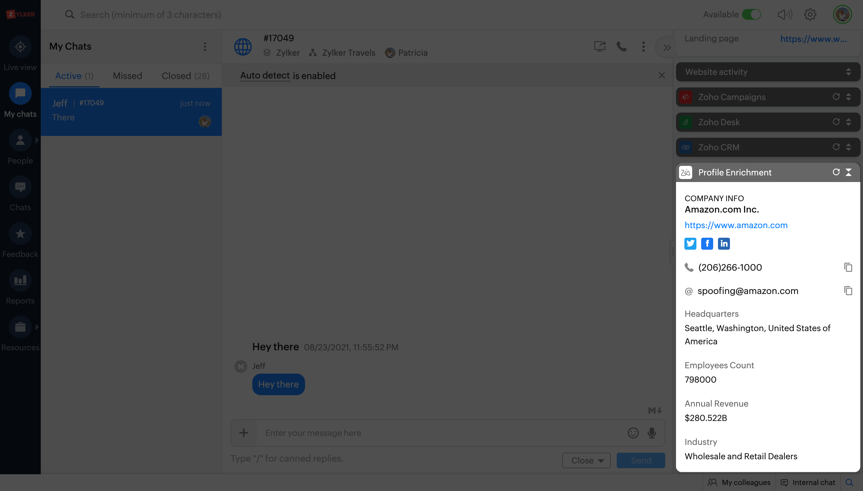 • これで、チャットウィンドウと[連絡先]タブ→[会社]で、Ziaによる訪問者情報の補完画面を表示して、訪問者の会社情報を確認できるようになります。