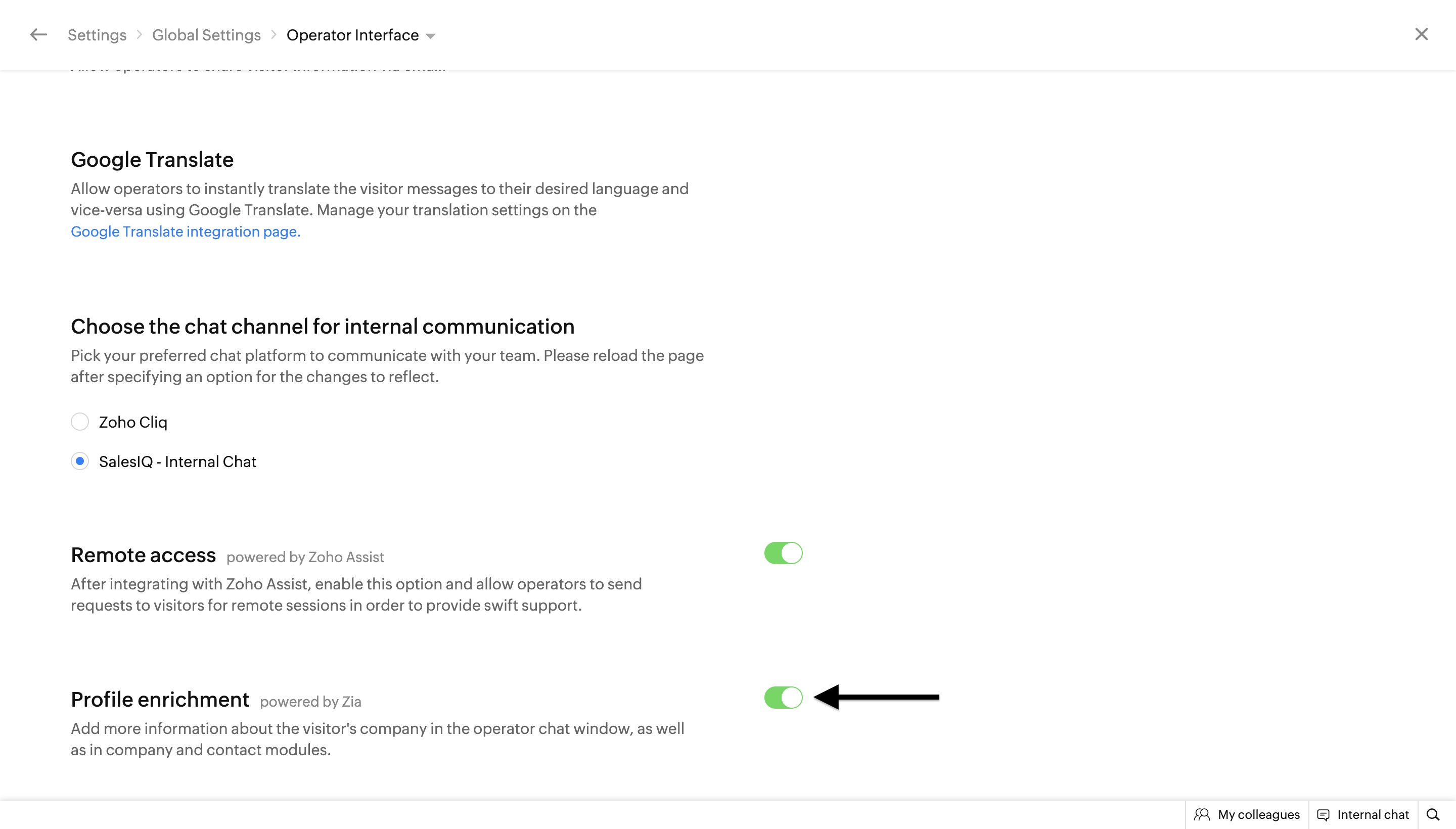 • 切り替えスイッチをクリックして、Ziaによる訪問者情報の補完機能を有効にします。