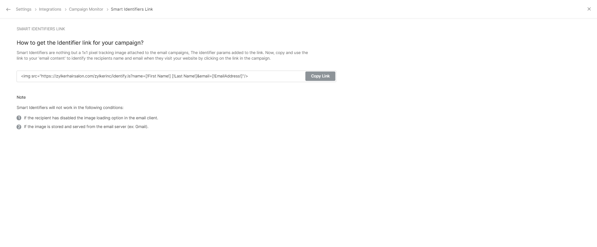 2. Campaign Monitor連携の設定画面には、次の2つの項目があります: [識別リンク] [スマート識別リンク]