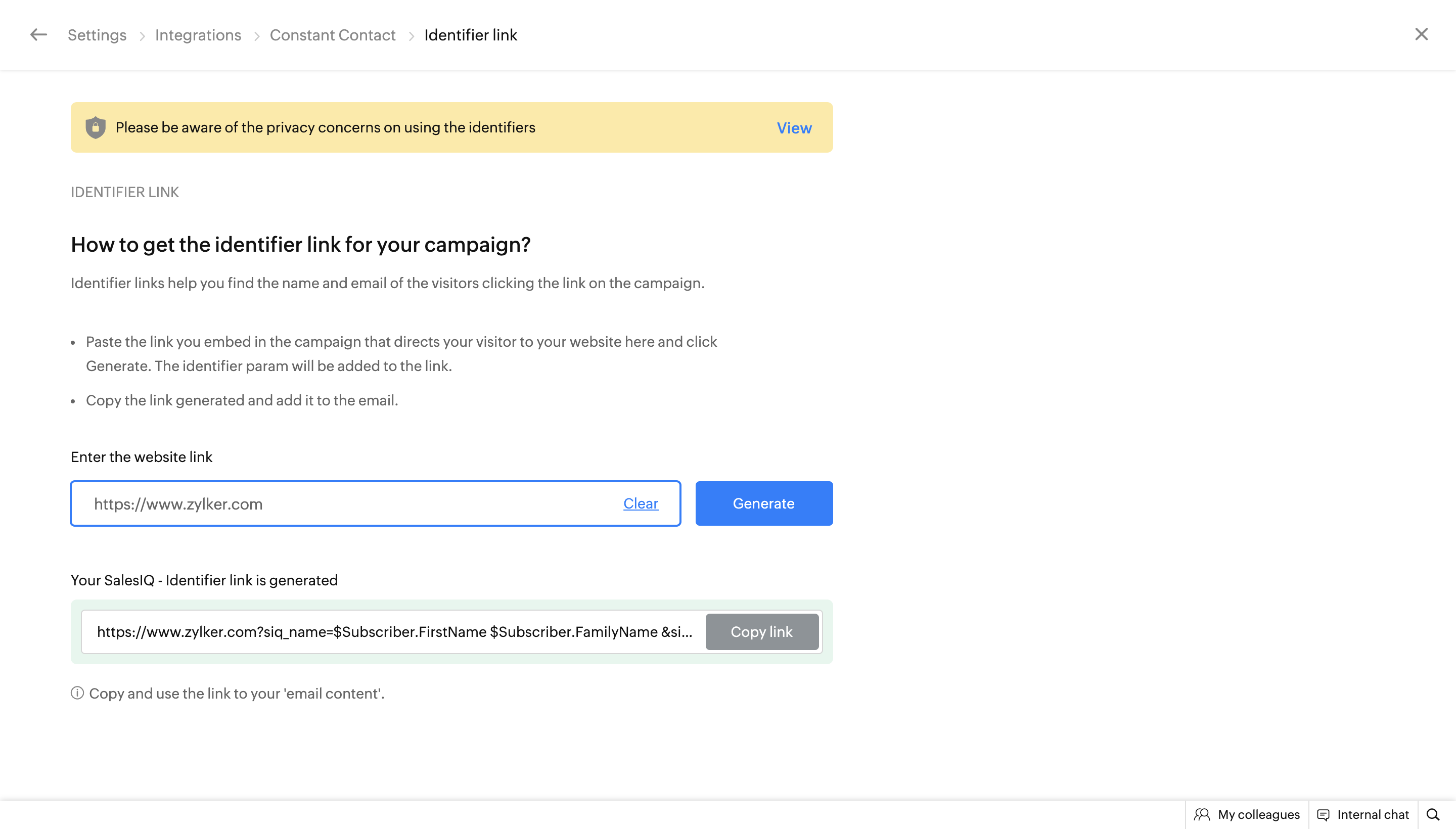 配信メールに記載したリンク(顧客をWebサイトに誘導するリンク)にZoho SalesIQの次のパラメーターを追加すると、Constant Contactの配信メールからWebサイトにアクセスした訪問者を識別できます。