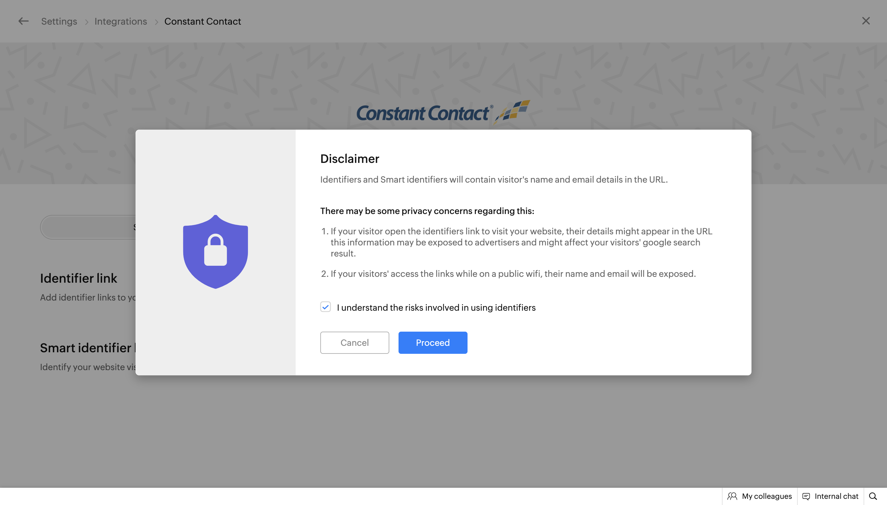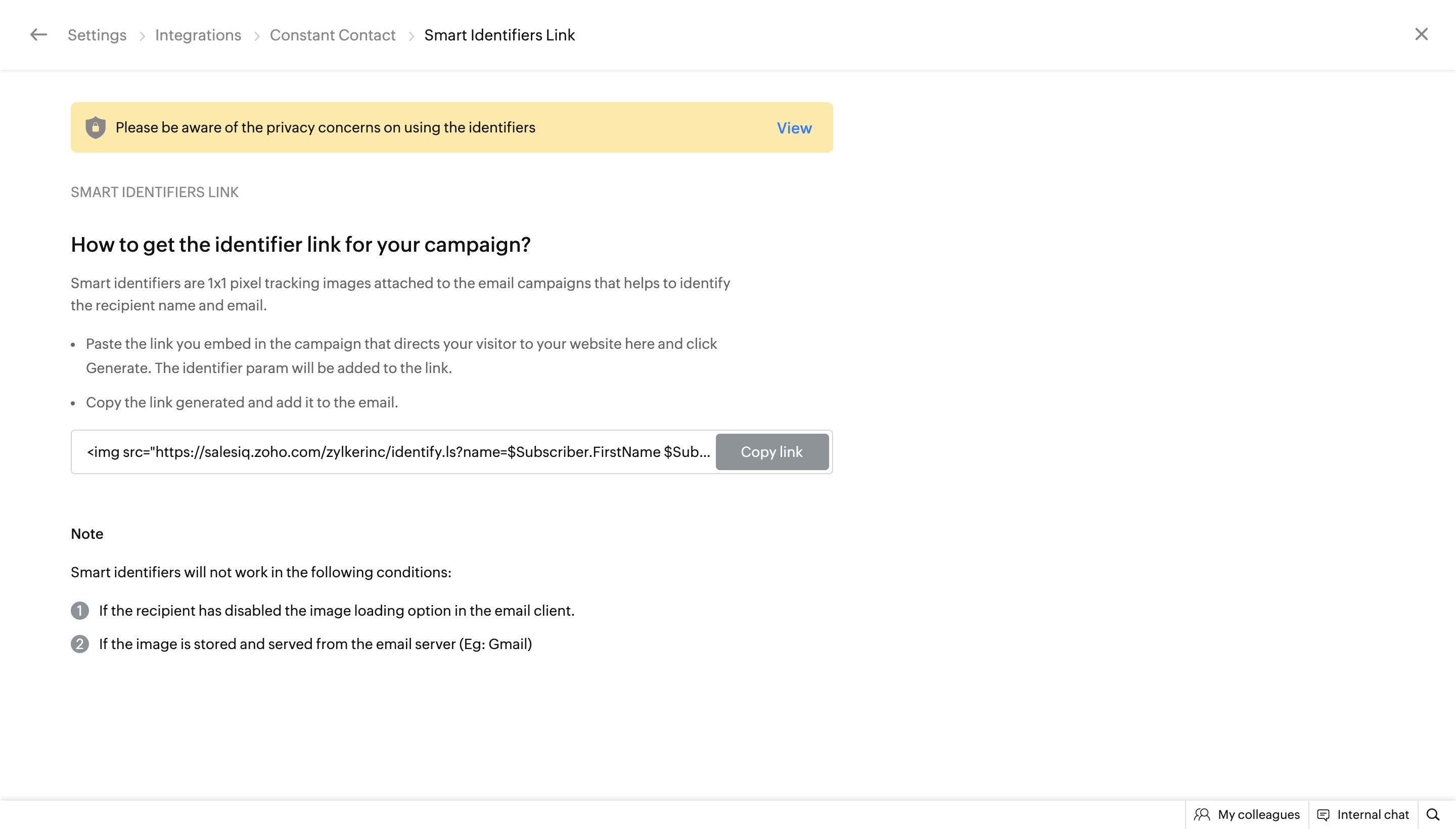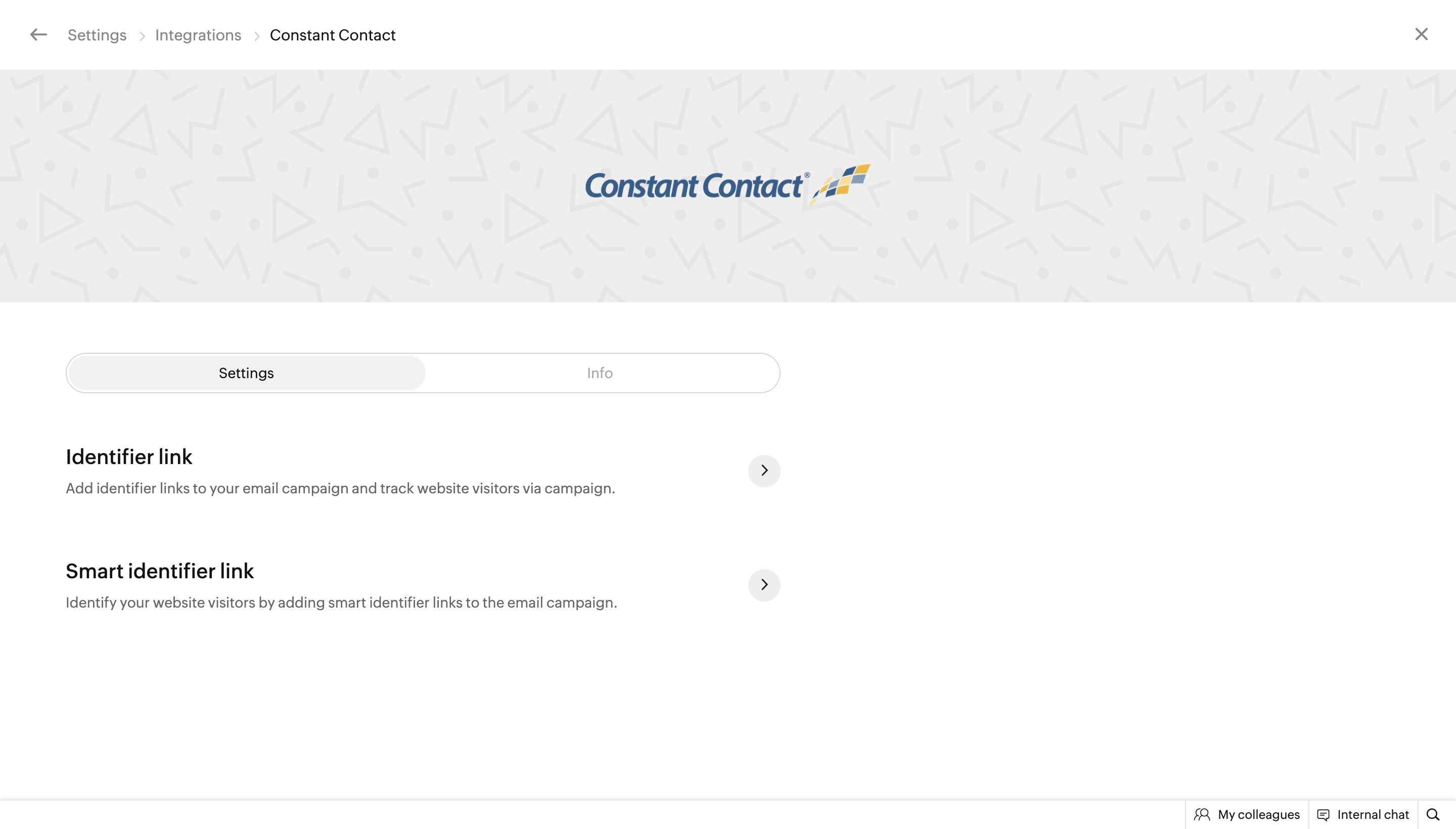 • Constant Contact連携の設定画面には、次の2つの項目があります:  [識別リンク]と[スマート識別リンク]。