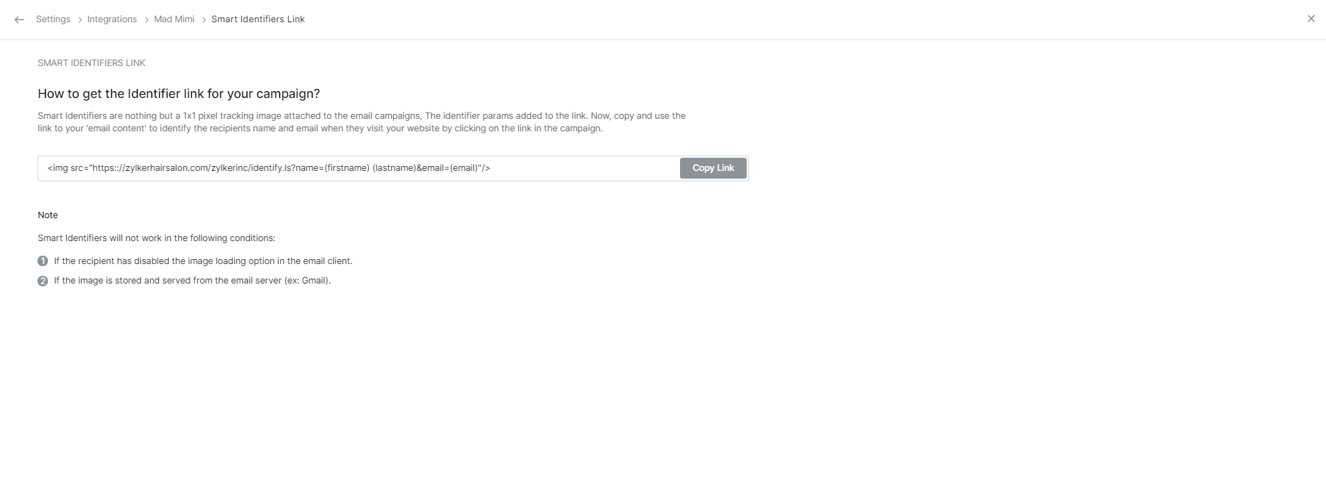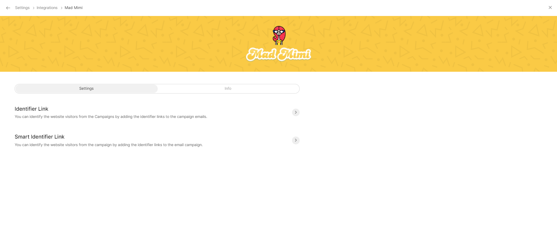 2. Mad Mimi連携の設定画面には、次の2つの項目があります:[識別リンク][スマート識別リンク]