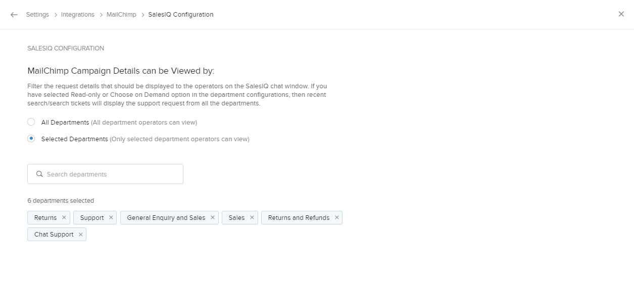 2. また、Zoho SalesIQの画面でキャンペーンの詳細を表示できる部門を選択することもできます。選択した部門のみがキャンペーンの詳細を表示できるようにするには、[選択中の部門]を選択します。