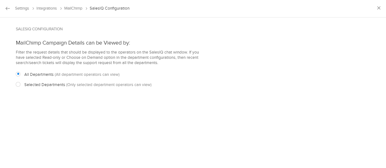1. 部門に関わらず、すべての担当者にキャンペーンの詳細情報を表示する場合、[Zoho SalesIQの設定]→[キャンペーンの詳細情報を表示できるユーザー]設定で、[すべての部門]を選択します。
