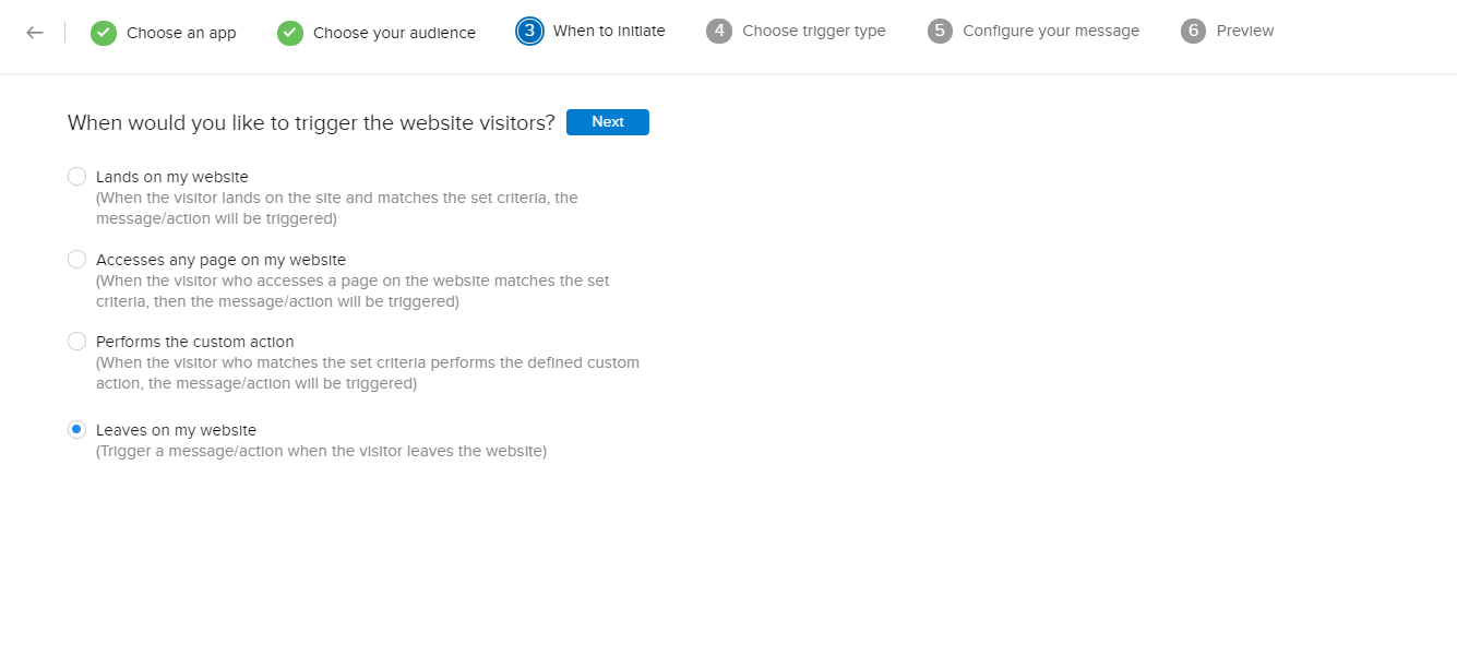 6. [自動処理の実行タイミング]設定で、[Webサイトからの離脱時]を選択します。[次へ]をクリックします。
