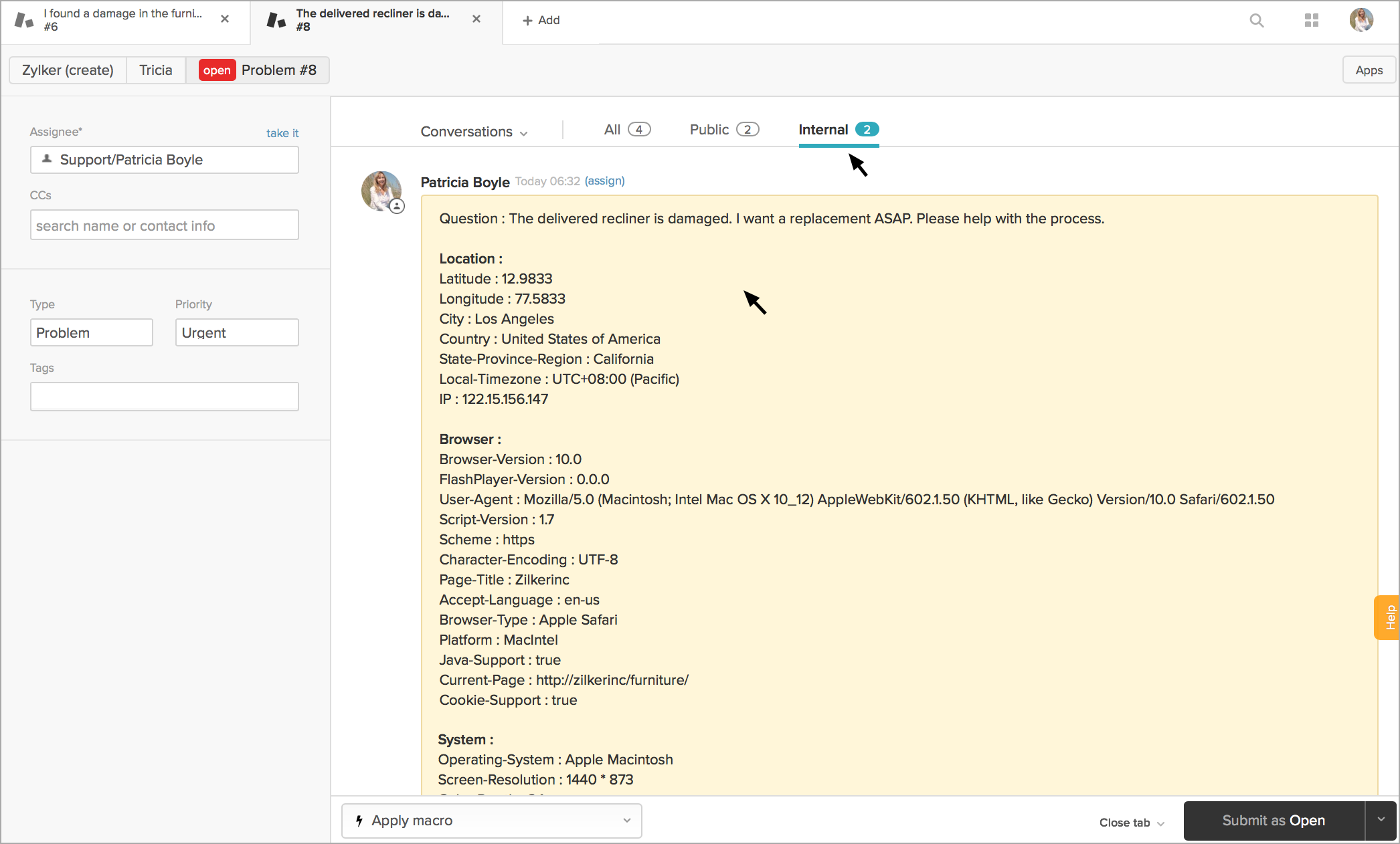 訪問者のチャットをチケットに変換すると、Zoho SalesIQで取得した重要な情報がZendeskに自動的に登録されます。Zendeskアカウントの[社内メモ]欄に、訪問者の情報が表示されます。この情報は、Zoho SalesIQにアクセスできないサポート担当者が訪問者に関する重要な情報を知るのに役立ちます。