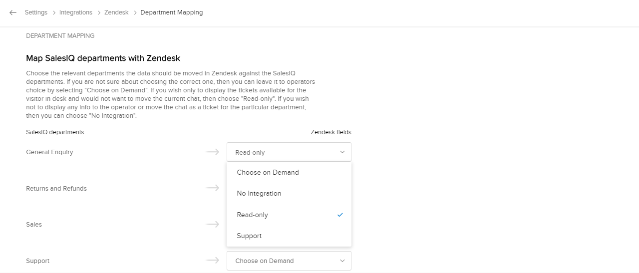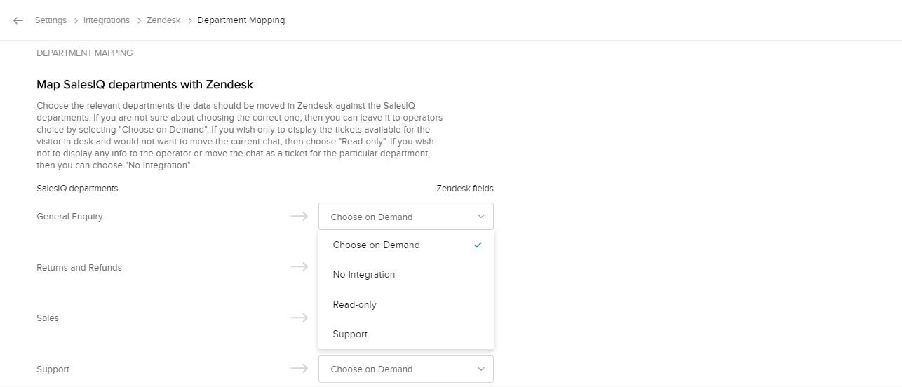 ZendeskとZoho SalesIQの両方で部門を設定できます。これにより、Zendeskの担当者が適切な顧客とチャットでやりとりし、Zoho SalesIQのチャットに基づくチケットが、Zendeskの適切な部門に関連付けられるように管理できます。