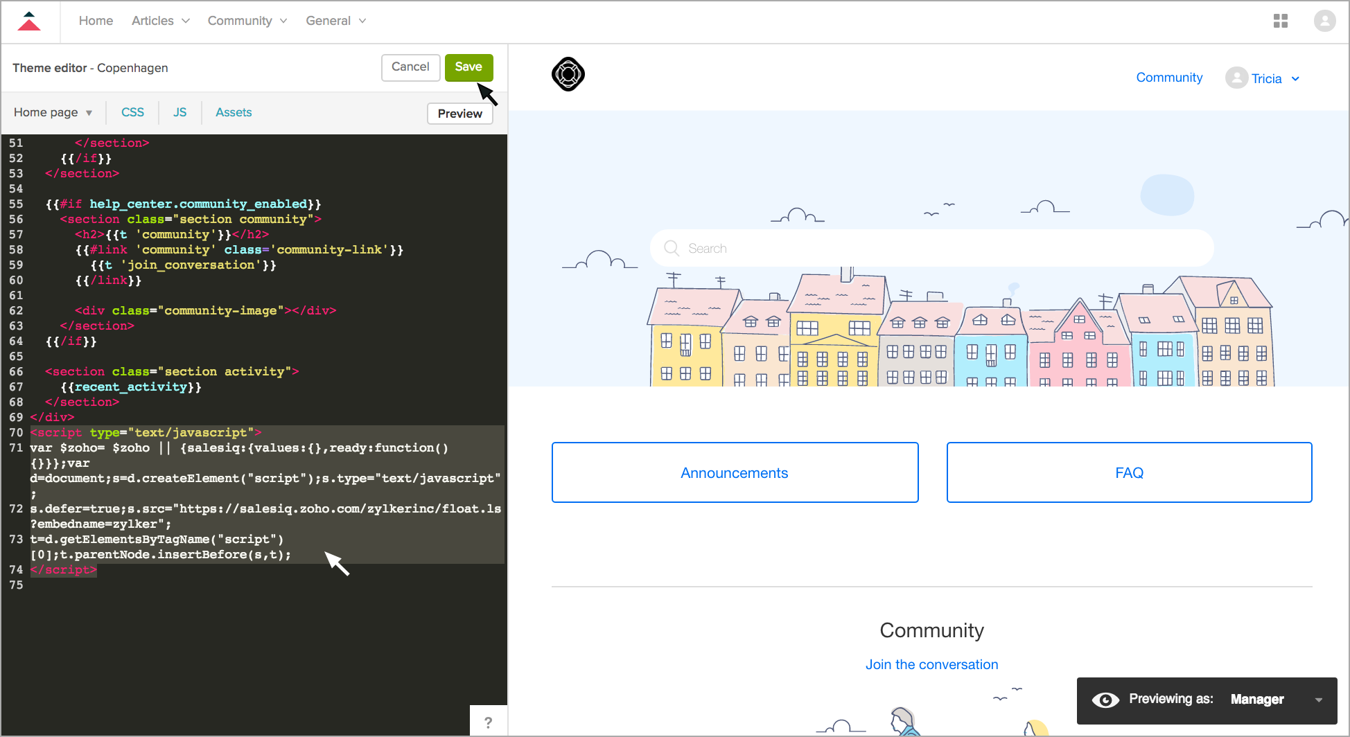 - Zoho SalesIQ内で記事をプレビューすることはできますが、編集はできません。連携設定を無効にすると、記事を編集できるようになります。連携を無効にすると、Zendeskの記事はZoho SalesIQの記事として設定されます。