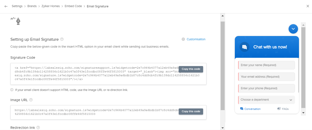 Zoho SalesIQでは、メールの署名ごとに専用のコードが生成されます。署名チャットのコードをコピーして、メールの署名欄の表示したい位置に貼り付けるだけで、送信するメールに署名チャットを挿入できます。