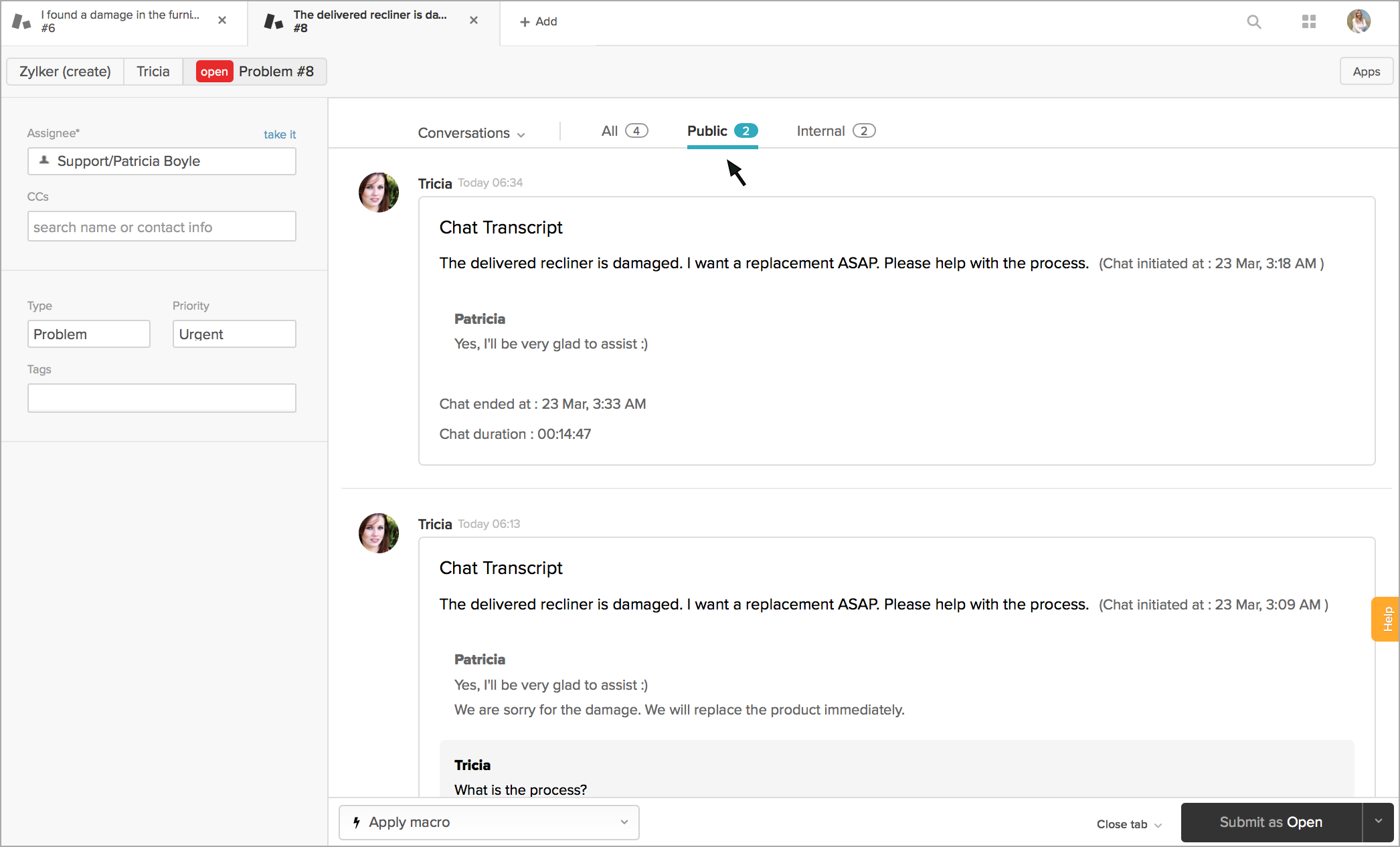 Zoho SalesIQでのZendeskのチケットの表示