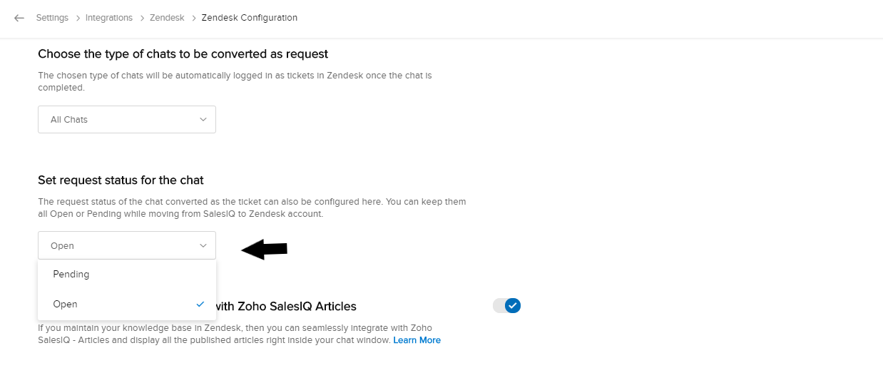 Zoho SalesIQで対応したチャットから変換されたZendeskチケットのステータスを選択できます。オープンや保留中などのステータスを指定できます。Zoho SalesIQで未対応のチャットから変換されたチケットのステータスは、[未完了]になります。