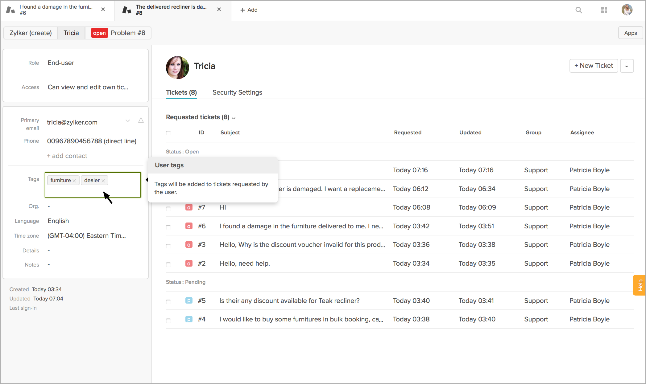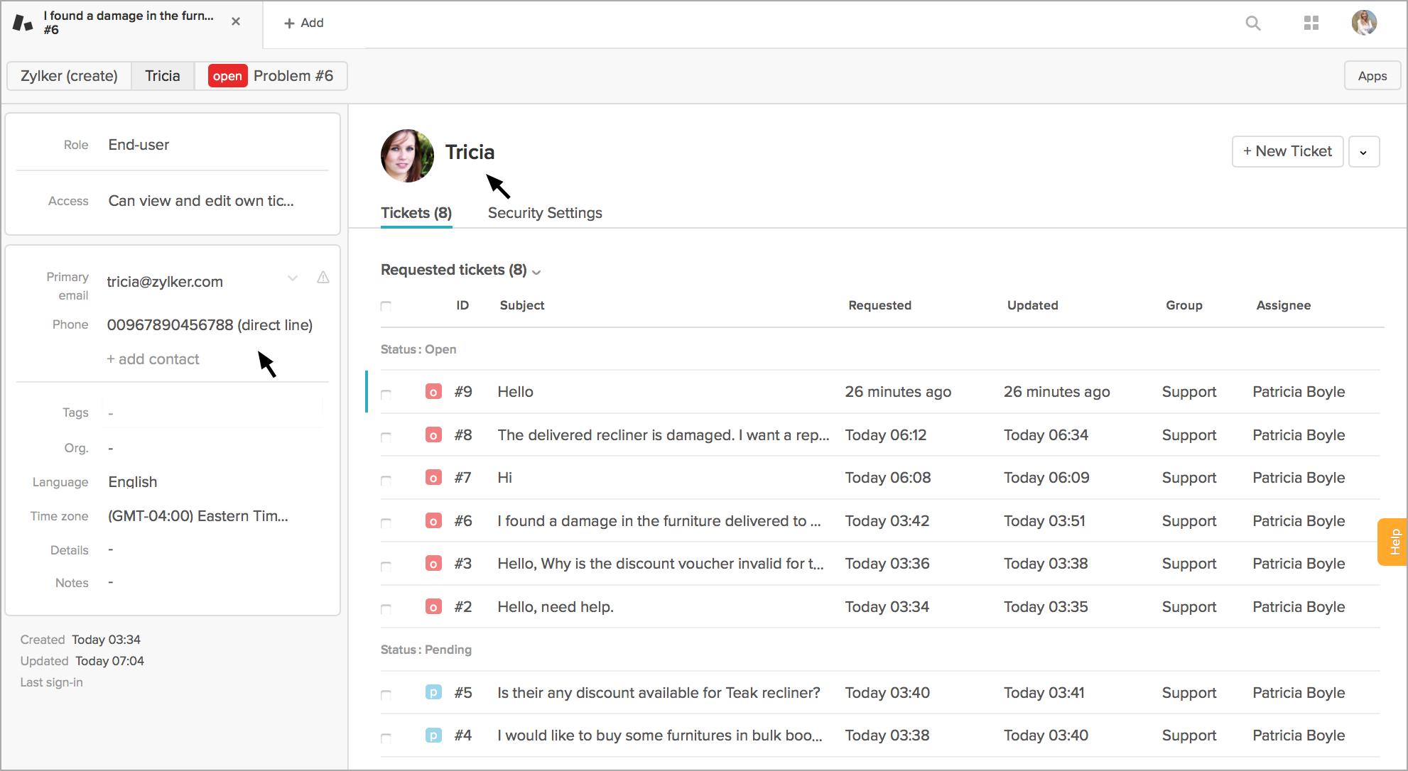 Zoho SalesIQの部門に[表示のみ]を設定した場合、該当の部門の担当者はZendeskの既存のチケットを表示できますが、新しいチケットの作成や、既存のチケットのステータスの変更はできません。