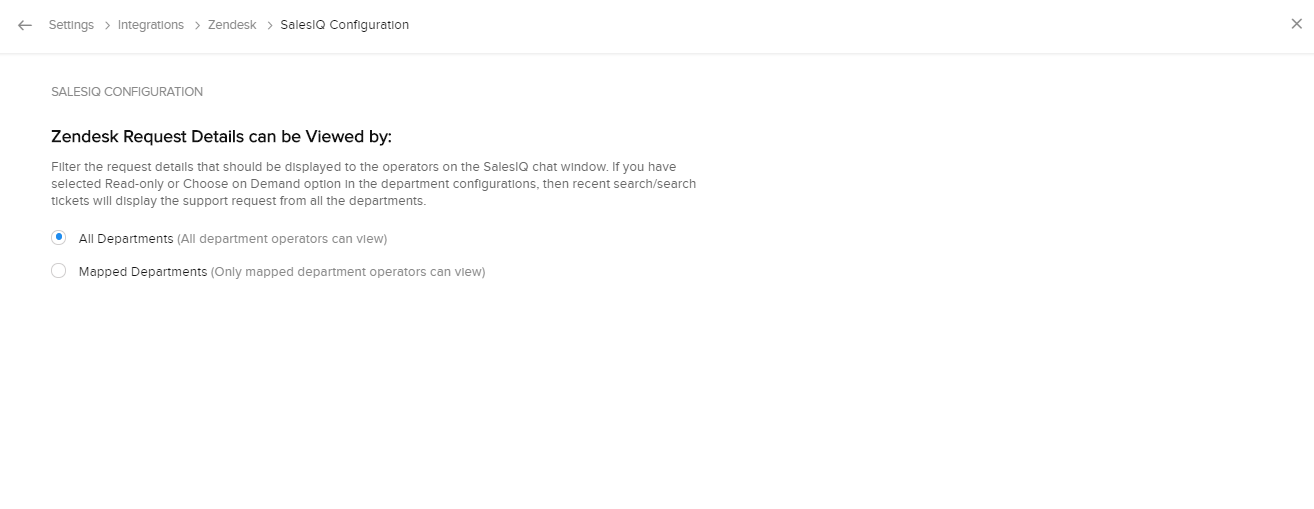 担当者のチャットウィンドウにある[Zendesk]タブでは、Zendeskから最近のチケットや検索結果を抽出できます。[Zoho SalesIQの設定]では、Zendeskから抽出するデータの部門を設定できます。次のいずれかを選択できます: