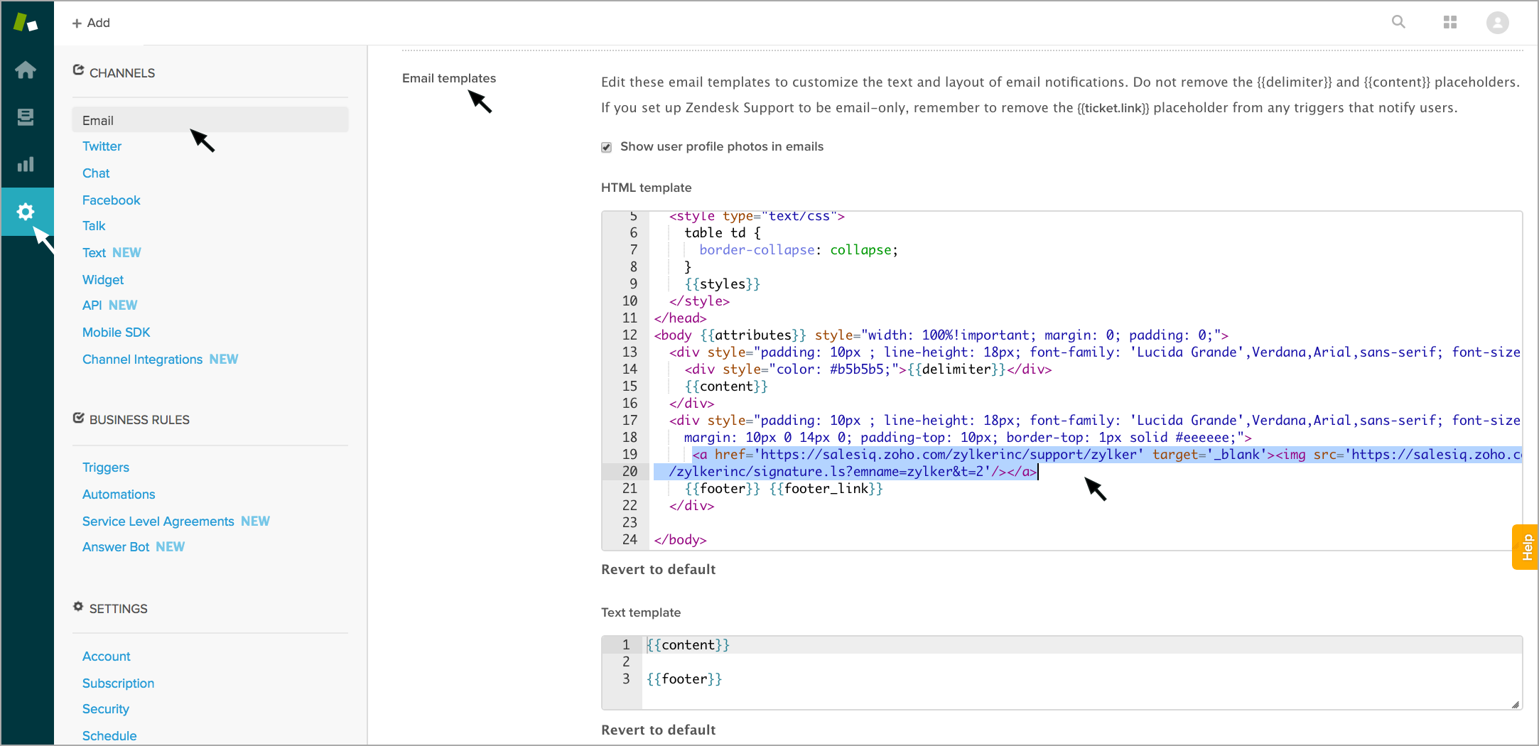 Zendeskから送信したメールへのZoho SalesIQのメールの署名の追加