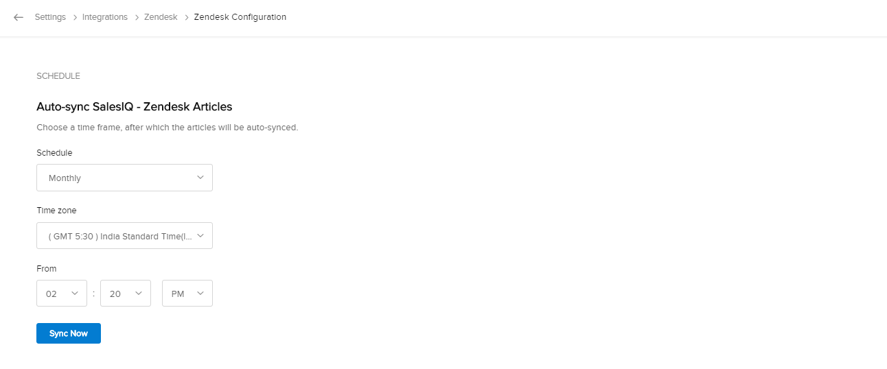 ZendeskからZoho SalesIQに記事を同期するには: