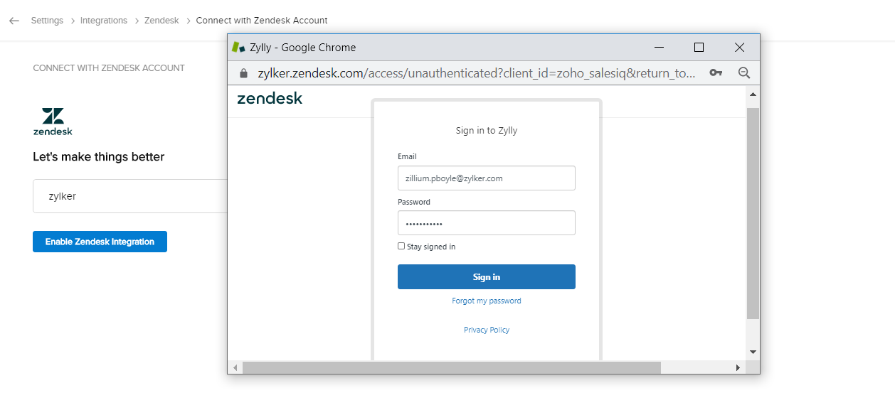 - [設定]タブでZendeskのポータル名を入力し、[Zendesk連携を有効にする]をクリックします。Zendeskのログインページが開きます。こちらで、Zendeskアカウントのユーザー名とパスワードを入力し、[Sign in](サインイン)をクリックします。Zoho SalesIQによるZendeskアカウント内のデータへのアクセス許可を求められます。内容を確認して、[Allow](許可する)をクリックします。