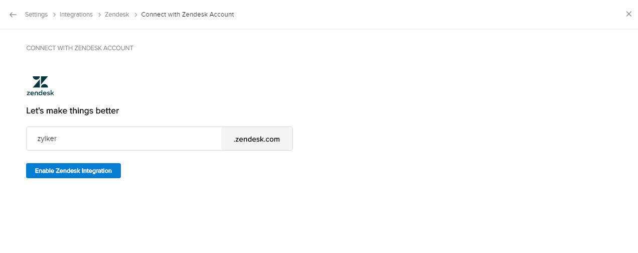 - 入力欄に新しいサブドメインまたは組織名を入力し、[Zendesk連携を有効にする]をクリックします。