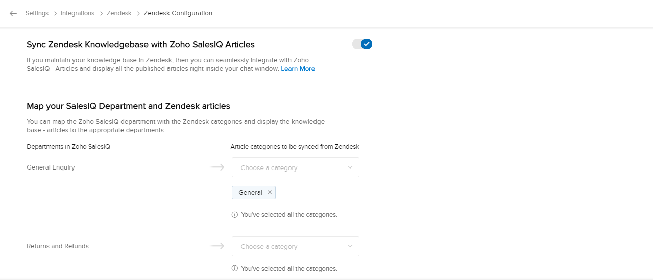 Zendeskの記事のカテゴリーは、Zoho SalesIQの1つの部門にのみ関連付けることができます。ただし、Zoho SalesIQの部門に対して、Zendeskの複数のカテゴリーを関連付けることはできます。