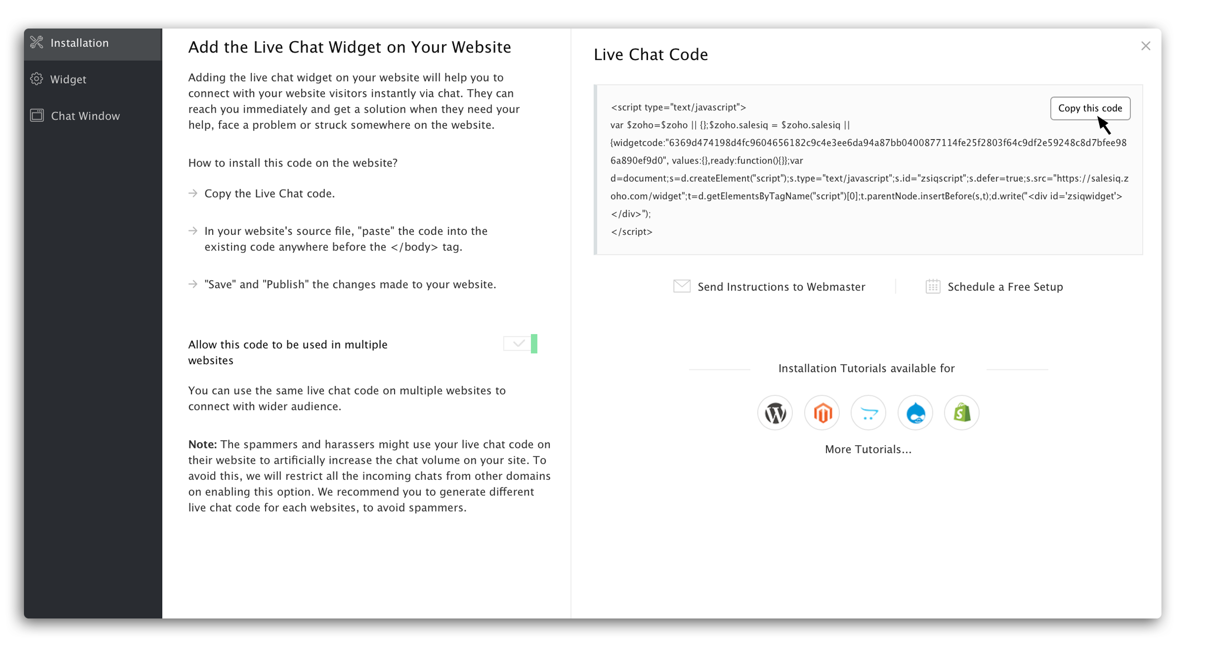 • [コード設定]→[Webサイト] の順に移動します。 手順1 に表示されたコードの [このコードをコピーする] ボタンをクリックすると、チャットのコードをコピーできます。