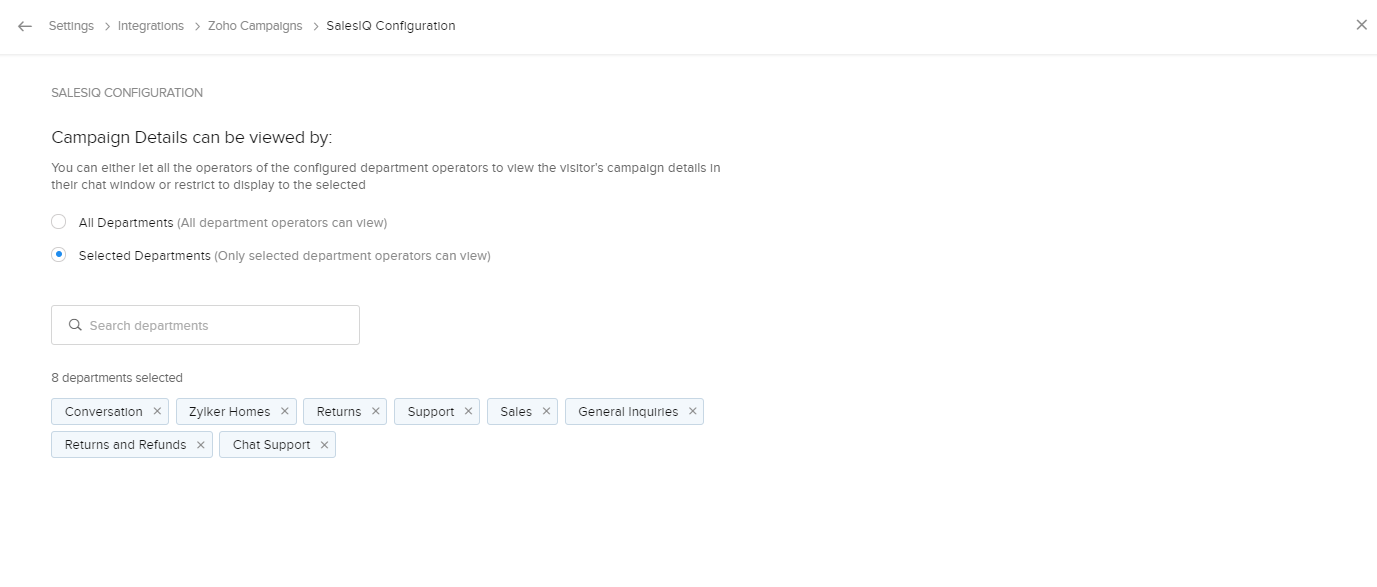 2. また、Zoho SalesIQの画面でキャンペーンの詳細情報を表示できる部門を選択することもできます。特定の部門でのみキャンペーンの詳細情報を表示できるようにするには、[キャンペーン詳細情報を表示できるユーザー]設定で[選択中の部門]を選択します。