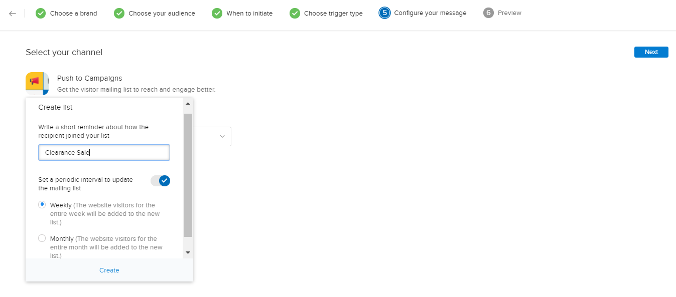 1. 新しい配信リストを作成する場合は、一覧の最下部にある[+ 新しいリストを作成する]リンクをクリックします。テキスト欄に新しい配信リスト名を入力して、配信リストの更新間隔(毎週または毎月)を設定し、[作成する]ボタンをクリックします。[次へ]をクリックします。