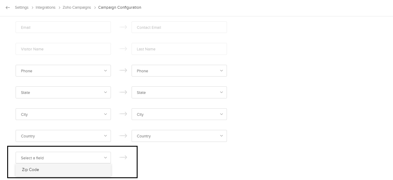 1. 次に、[Campaignsの項目]のドロップダウンから、対応するZoho Campaignsの項目を選択します。