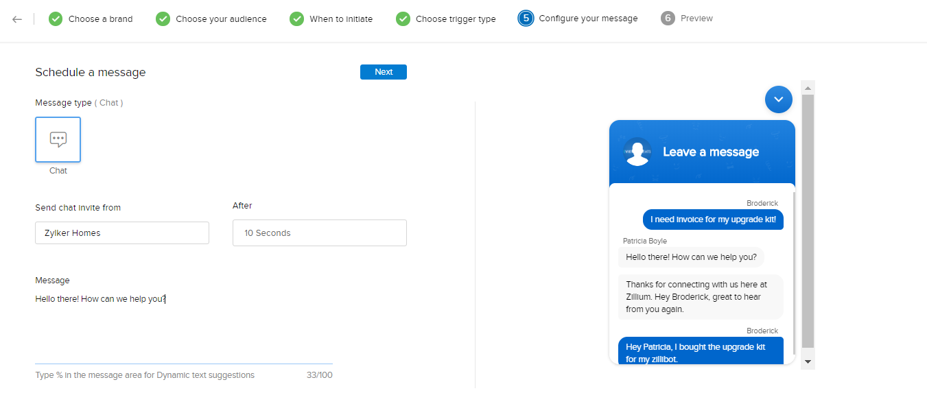 1. 入力画面が表示されます。チャットウィンドウで、Webサイトの訪問者に表示したいテキストを入力します。次に、ドロップダウンから配信リストを選択し、[保存する]をクリックします。