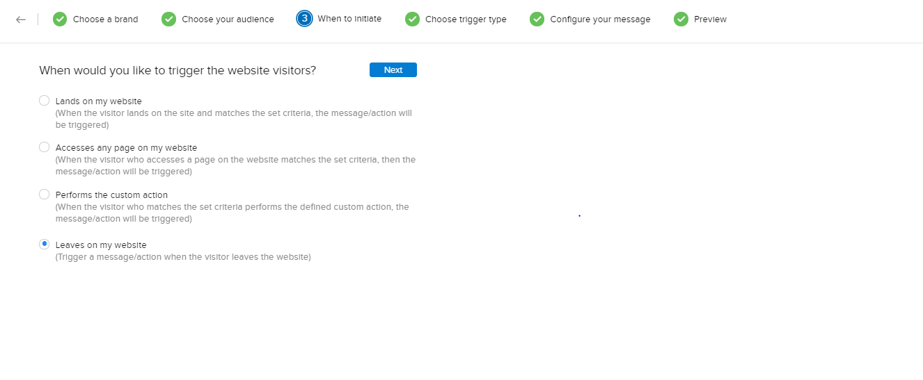 4. [自動処理の実行タイミング]設定で、[Webサイトからの離脱時]を選択します。[次へ]をクリックします。