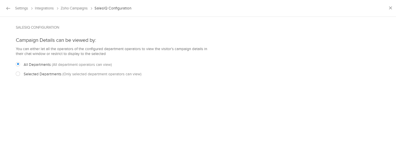 1. 部門に関わらず、すべての担当者にキャンペーンの詳細情報を表示する場合、[Zoho SalesIQの設定]→[キャンペーンの詳細情報を表示できるユーザー]設定で、[すべての部門]を選択します。
