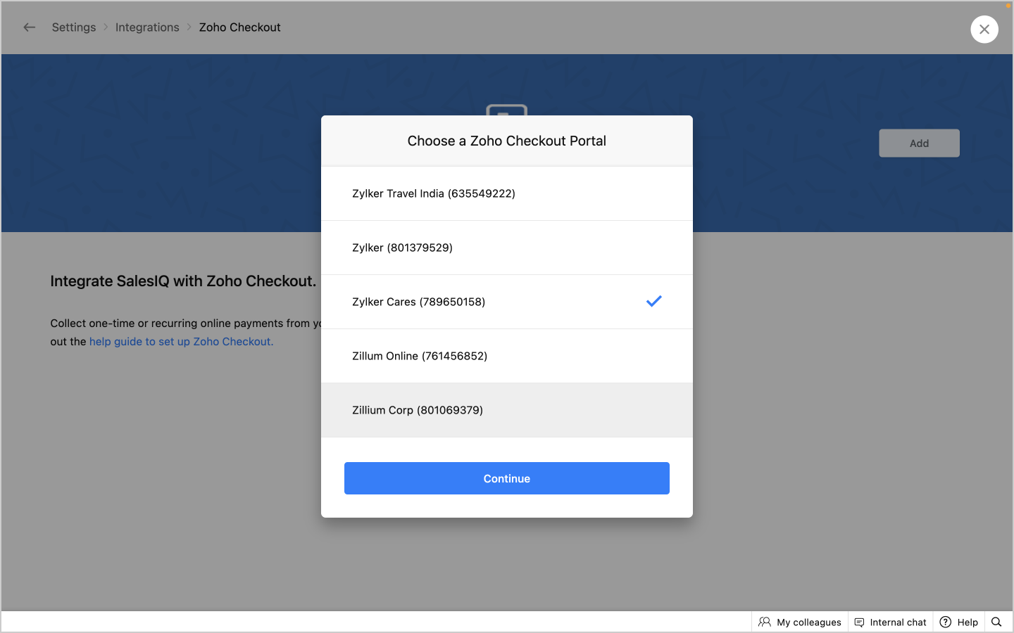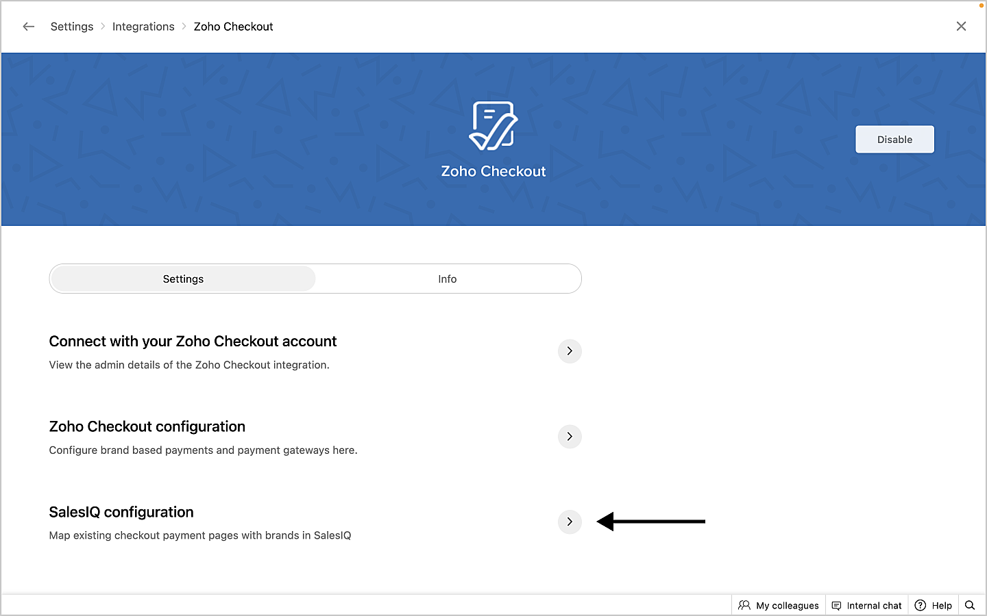 Zoho Checkoutのにおける商品/サービスごとの決済用の設定(決済ページ)をZoho SalesIQのブランドと関連付けます。