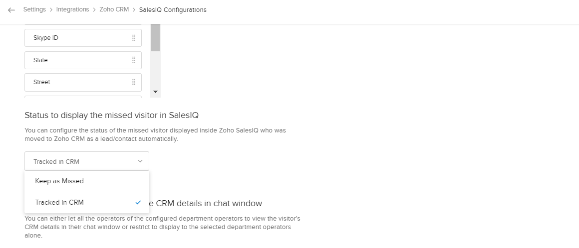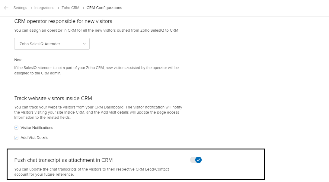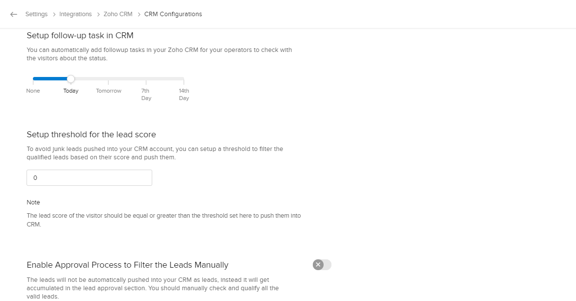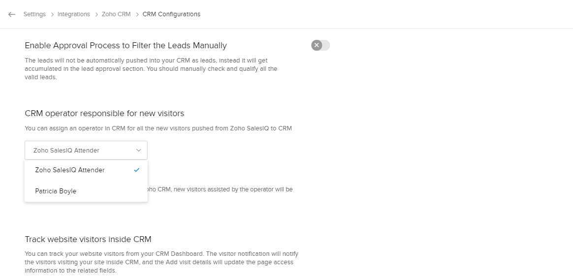 Zoho SalesIQとZoho CRMのアカウントの連携後、ニーズに合わせて詳細を設定できます。連携の詳細設定は、次のとおりです。