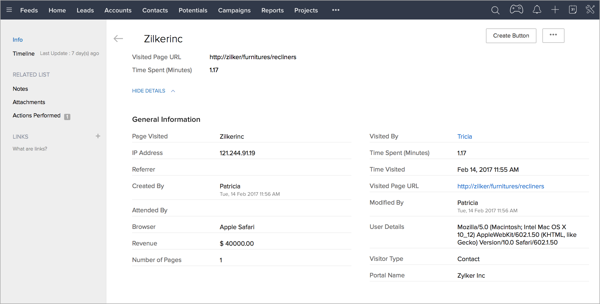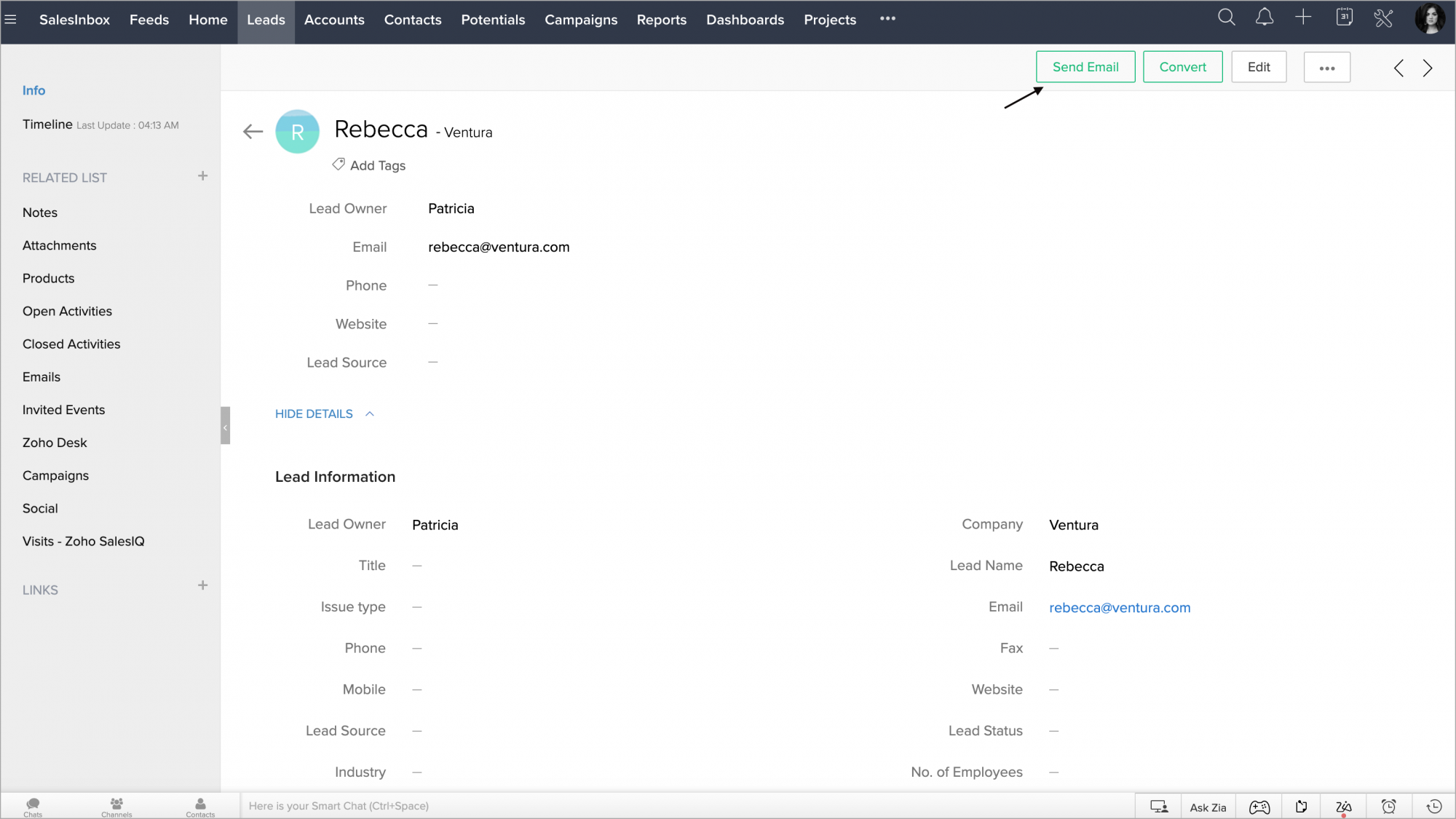 - ブラウザーの新しいタブで、Zoho CRM内の顧客に関する詳細情報がすべて表示されます。