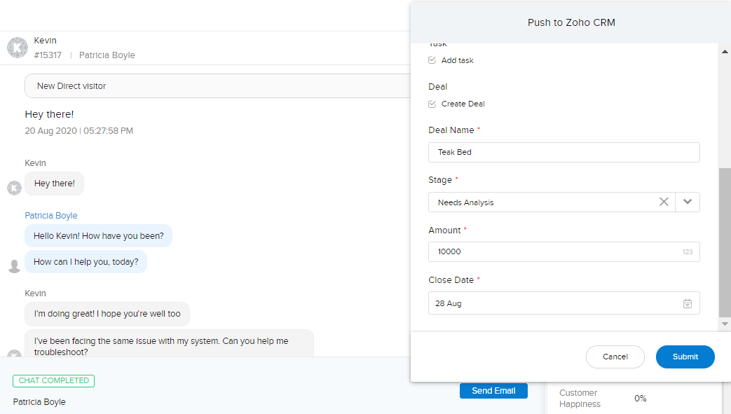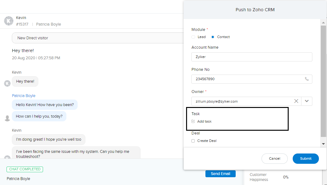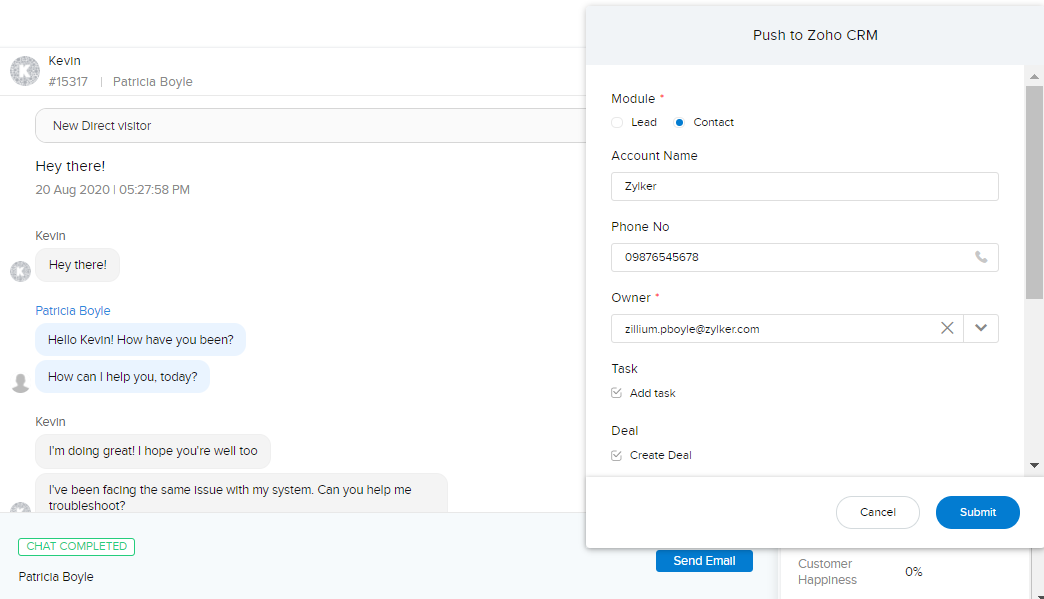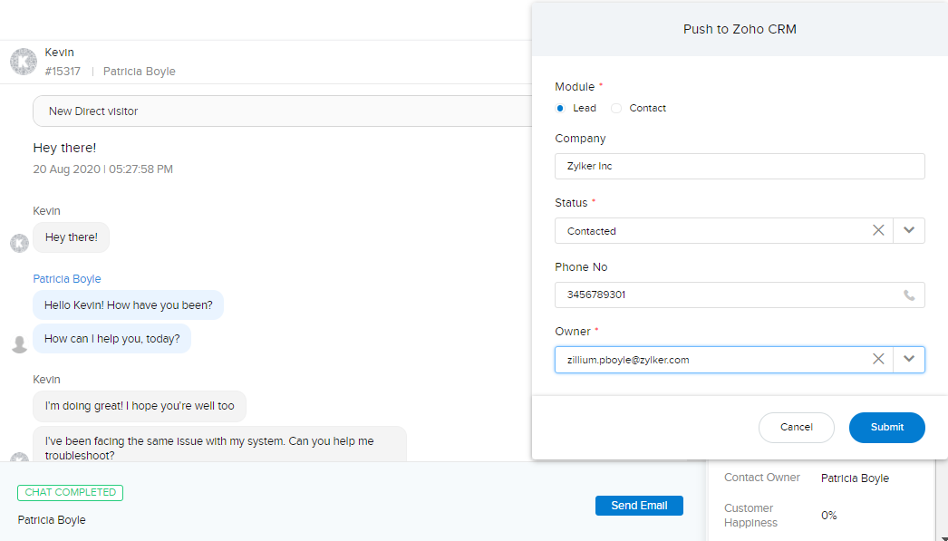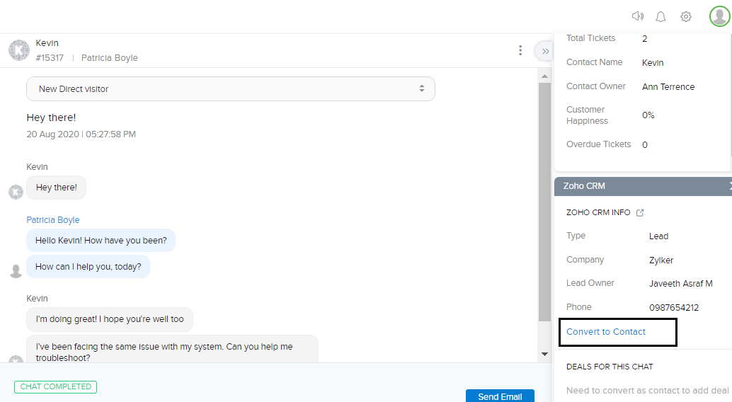 訪問者とのチャット内容を、Zoho CRM内の見込み客/連絡先などの該当データに更新して、後で参照できます。