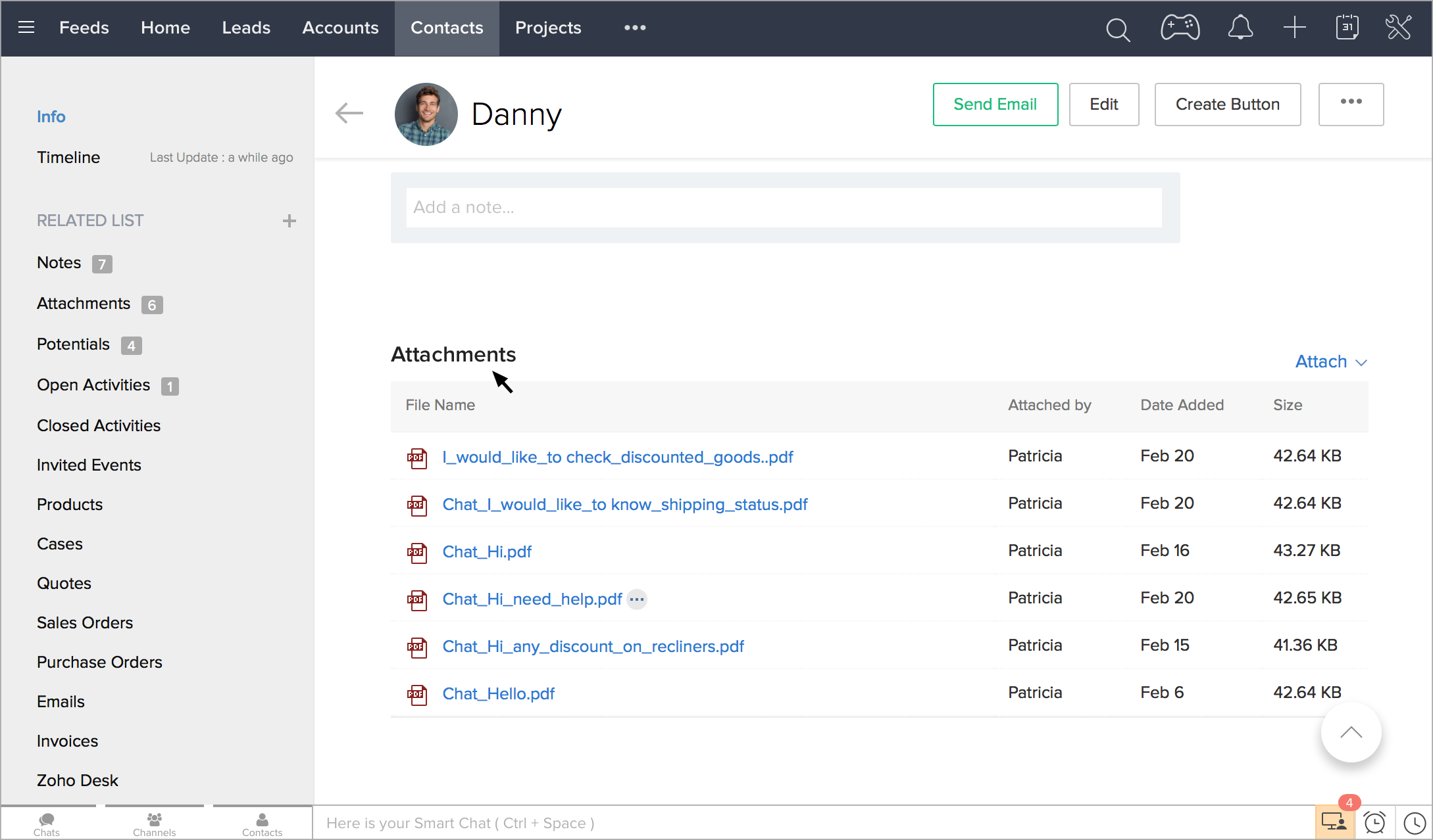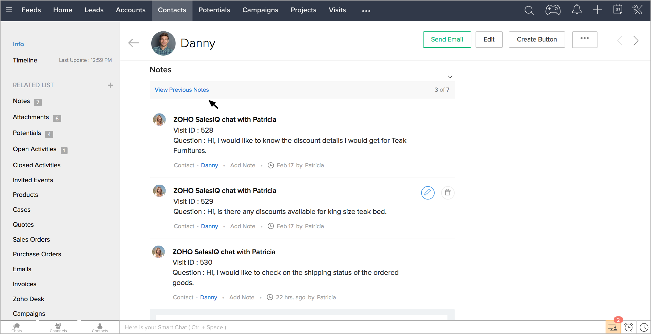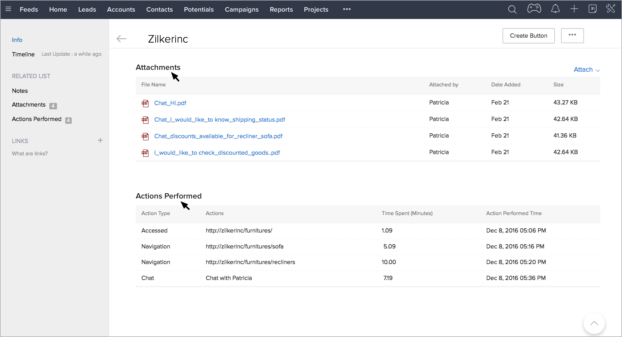 訪問者とのチャット内容を、Zoho CRM内の見込み客/連絡先などの該当データに更新して、後で参照できます。