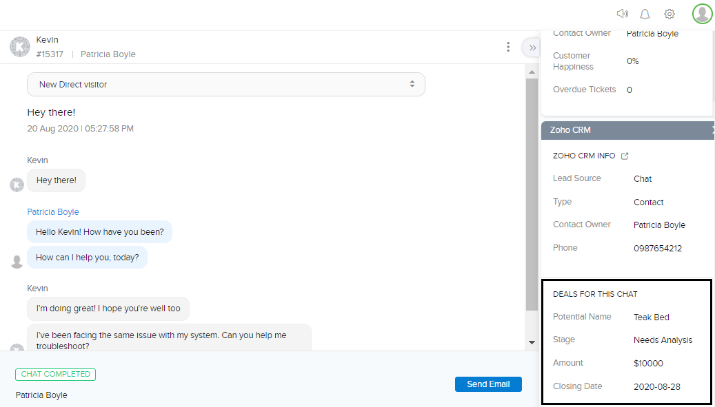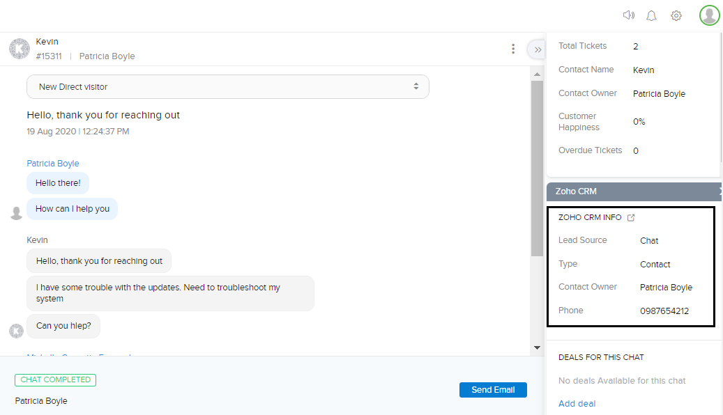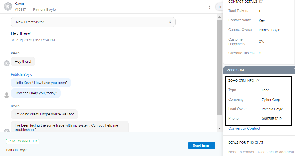 訪問者がZoho SalesIQを通じてチャットを開始すると、チャットに入力された訪問者の情報がZoho CRMの顧客データベースで照合されます。訪問者の情報がデータベースに登録されている情報と一致する場合、Zoho SalesIQの担当者のチャットウィンドウの右側に、Zoho CRMの情報が自動で表示されます。