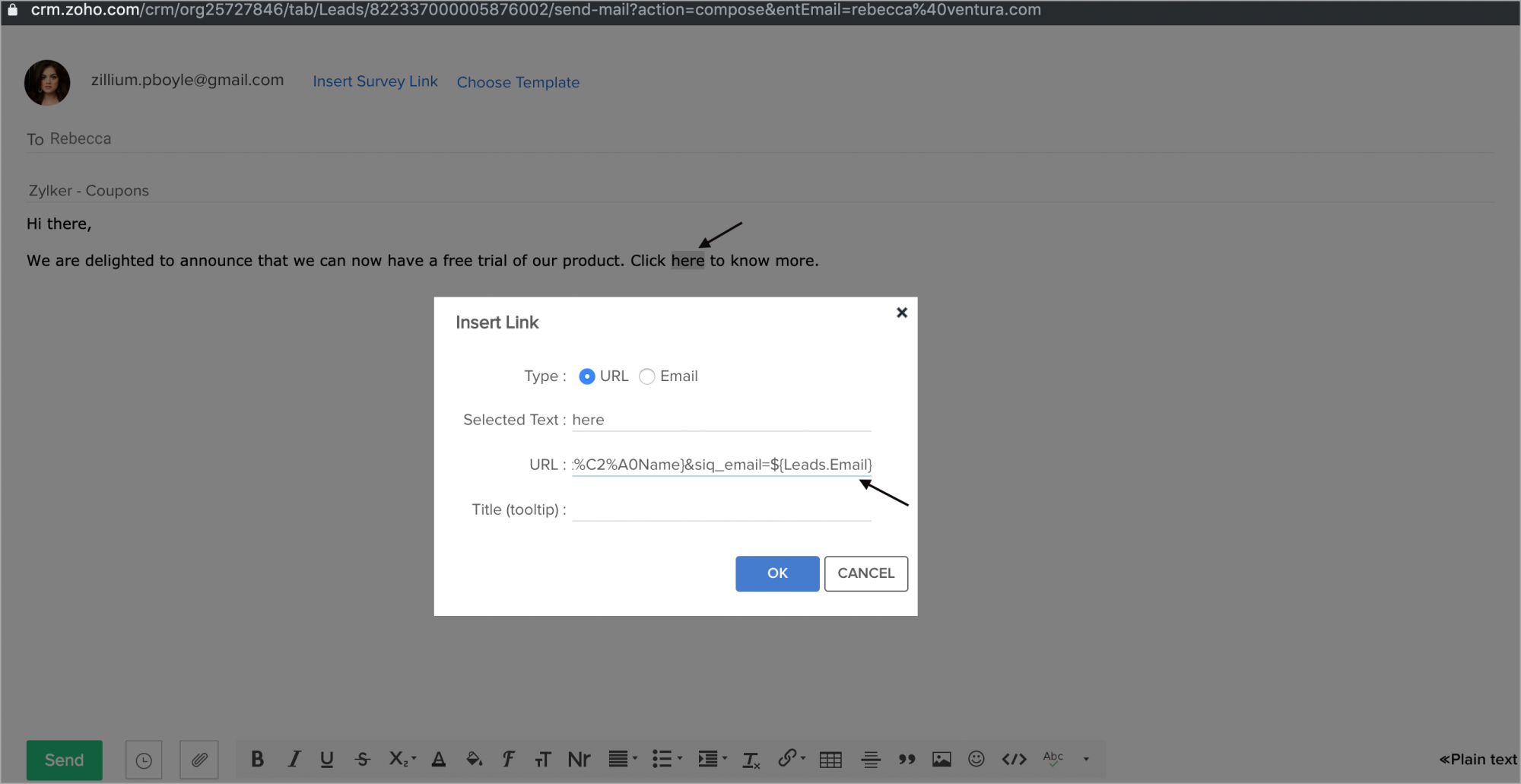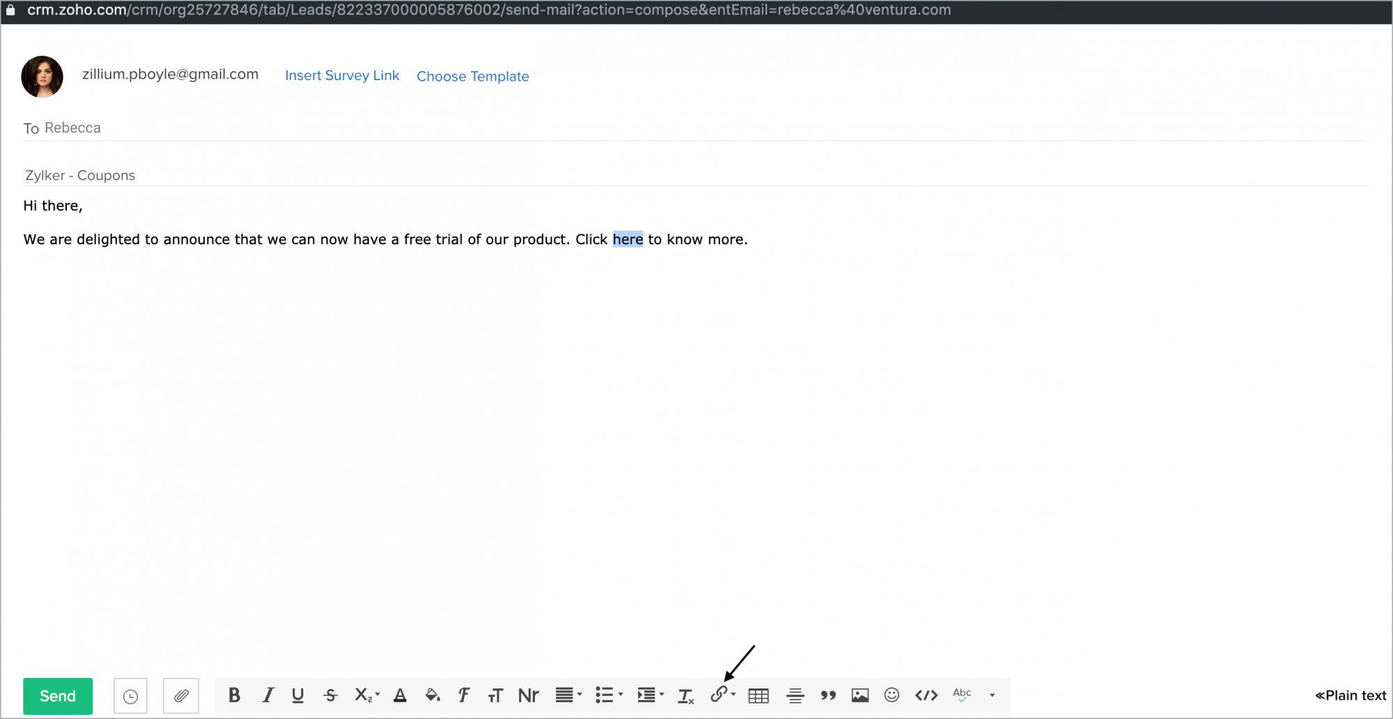 - 下書きを作成し、対象のURLを選択して、[SalesIQのリンクを挿入する]リンクをクリックします。リンクのプレビューを確認し、[保存する]をクリックします。