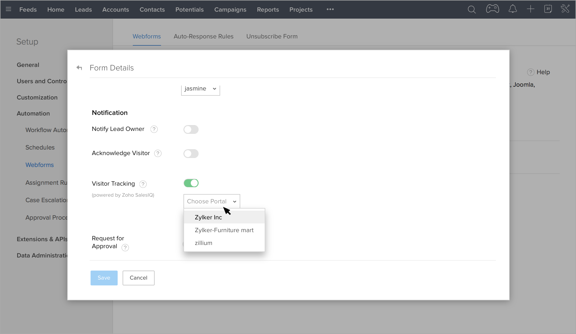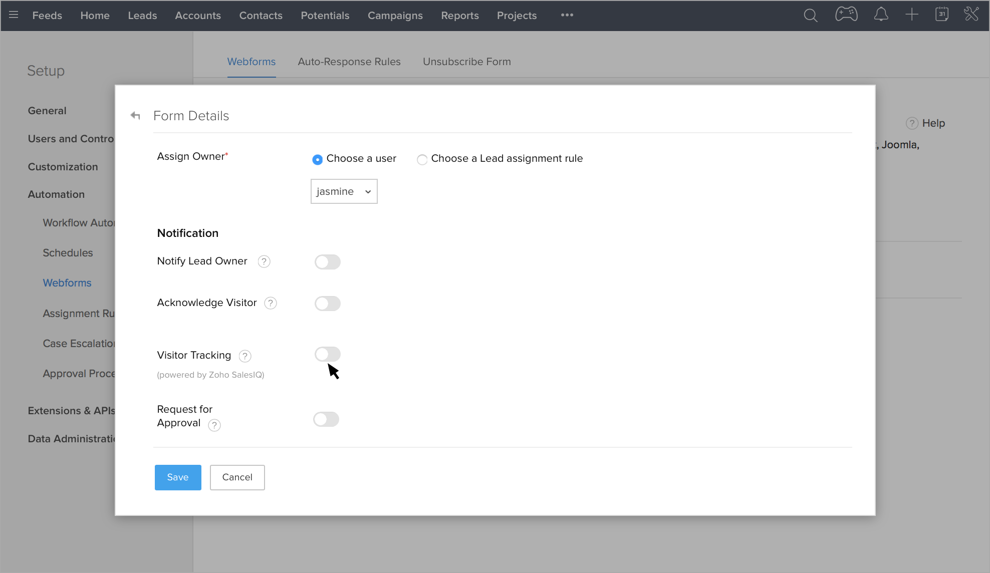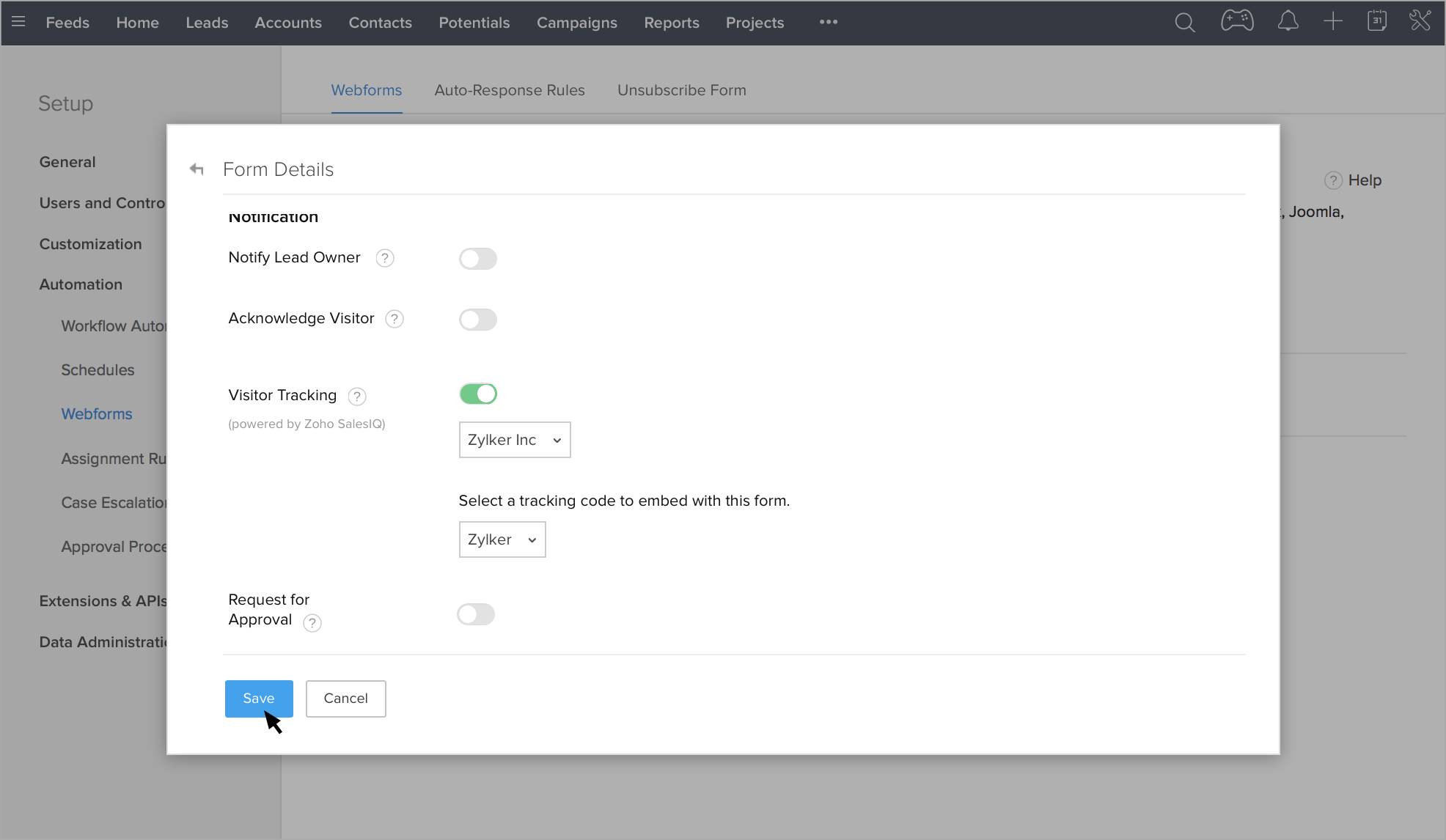 Zoho CRMのWebフォームで訪問者の追跡を有効にするには