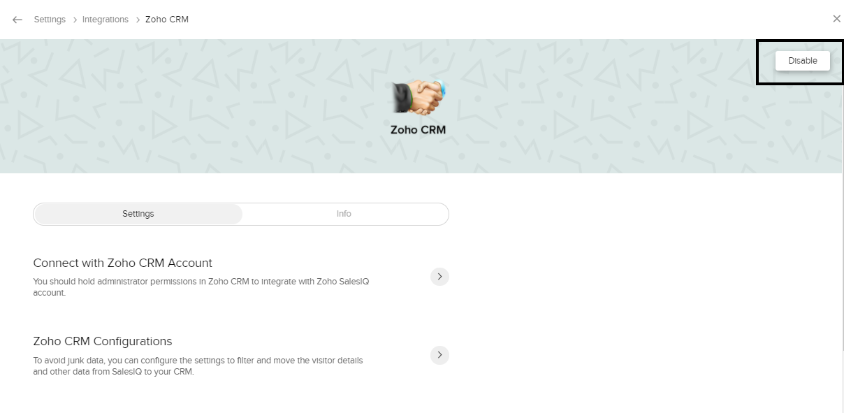 必要に応じて、いつでもZoho SalesIQとZoho CRMの連携を無効にできます。