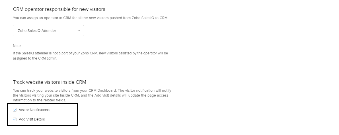 - 訪問者の通知:Zoho CRM内でのWebサイトの訪問者に関する通知を、有効または無効に設定できます。