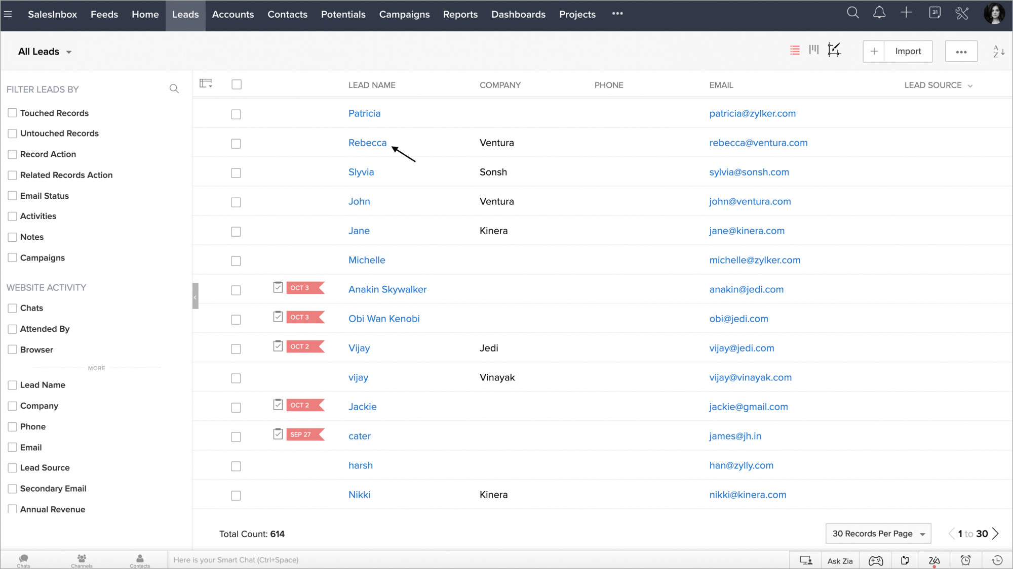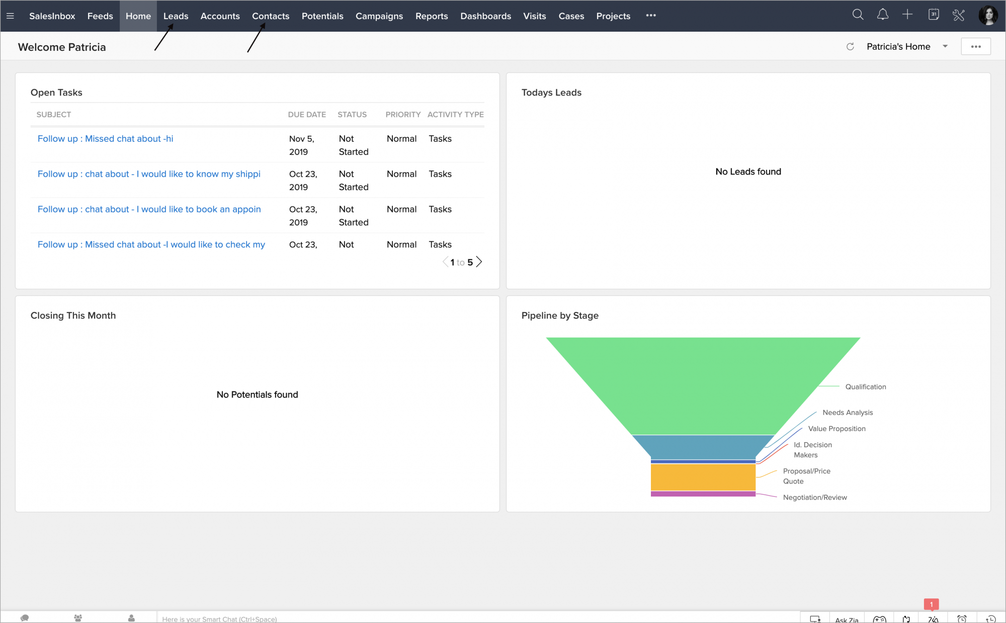- Zoho CRMアカウント内で、[見込み客]タブまたは[連絡先]タブに移動します。