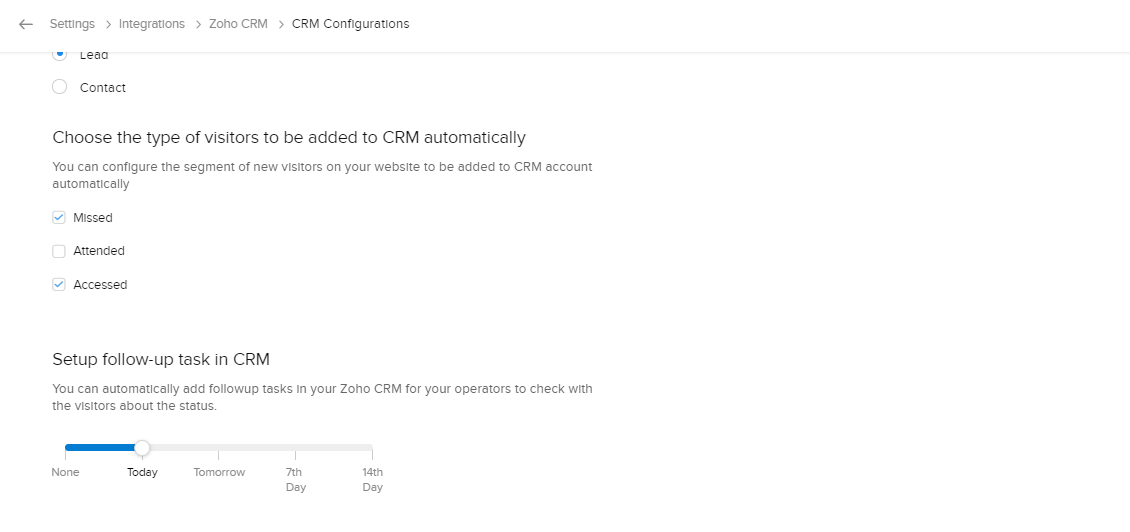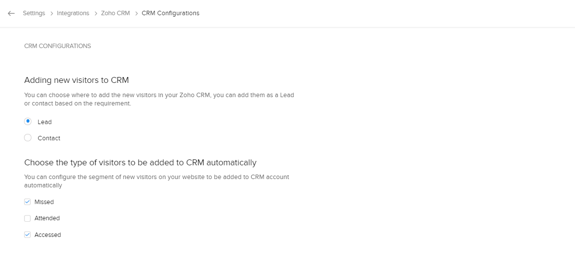 連携を通じて、各訪問者を追加するZoho CRMのタブを選択できます。[見込み客]または[連絡先]のいずれかを選択できます。