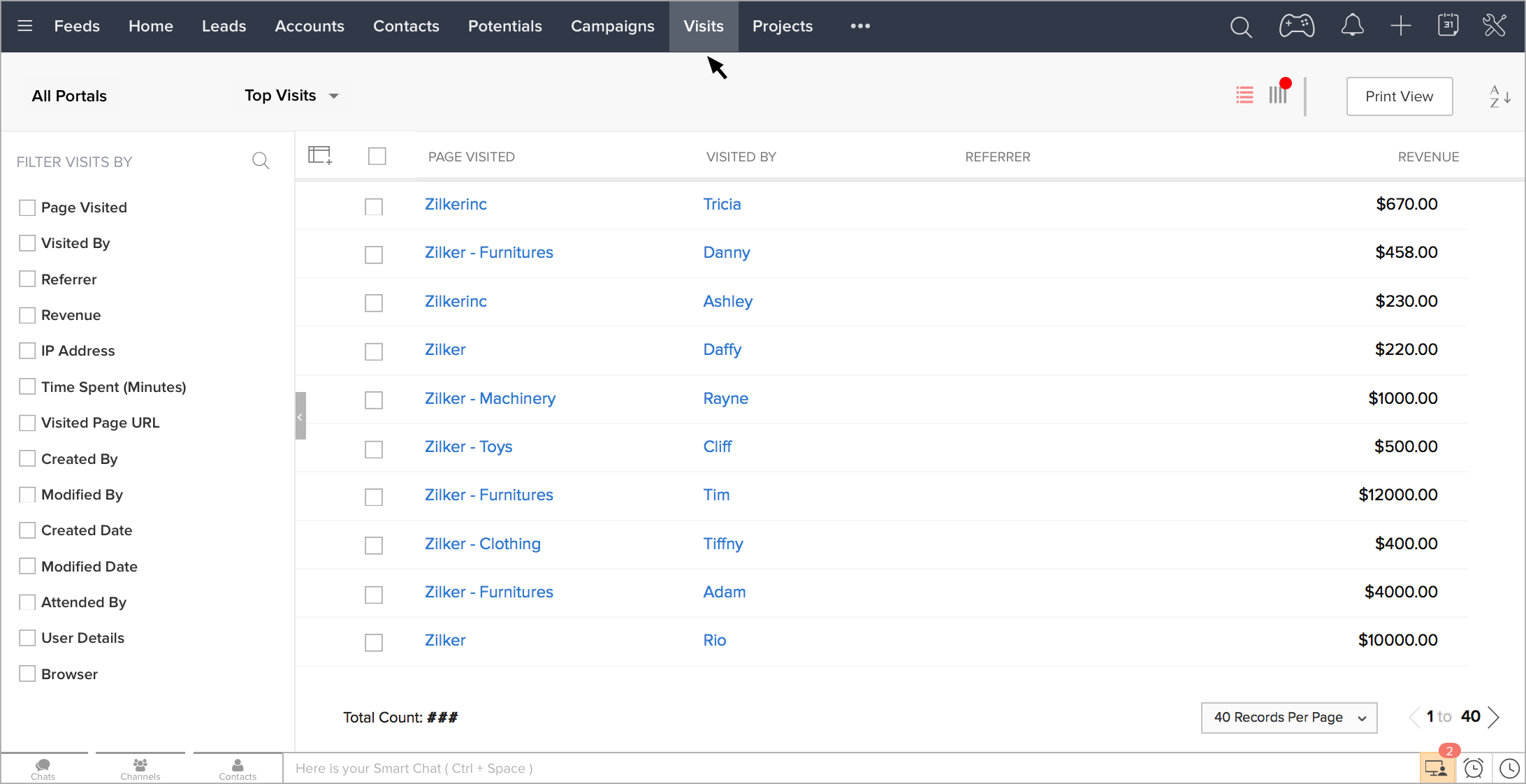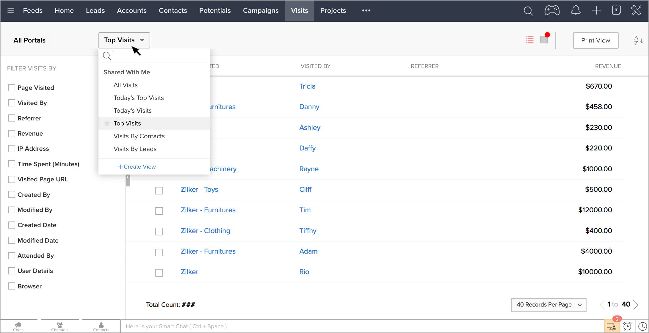 Zoho CRMの[訪問]タブで、Webサイトにアクセスした訪問者を確認できます。訪問者がWebサイトにアクセスし、訪問者の情報が識別されると、訪問者の詳細が[訪問]タブに表示されます。訪問者が担当者とチャットした場合、チャット内容も添付されます。