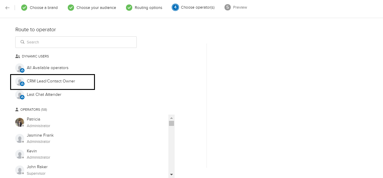 - Zoho CRMの担当者と[Zoho SalesIQでの対応者]の選択肢が一覧表示されます。