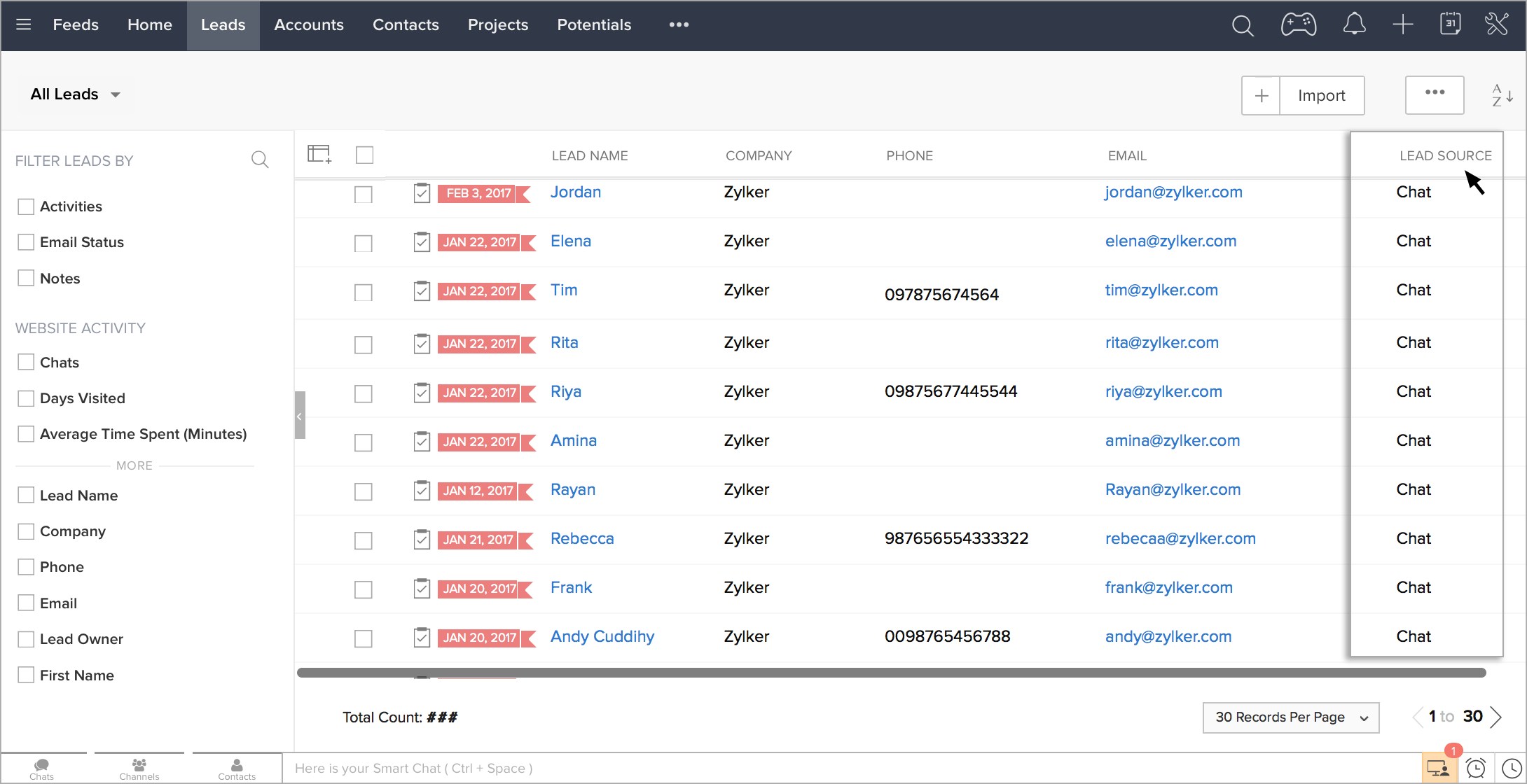 [見込み客のデータ元]が[チャット]である見込み客データを検索して抽出することで、Zoho SalesIQを通じて登録された見込み客の件数等の情報を確認できます。