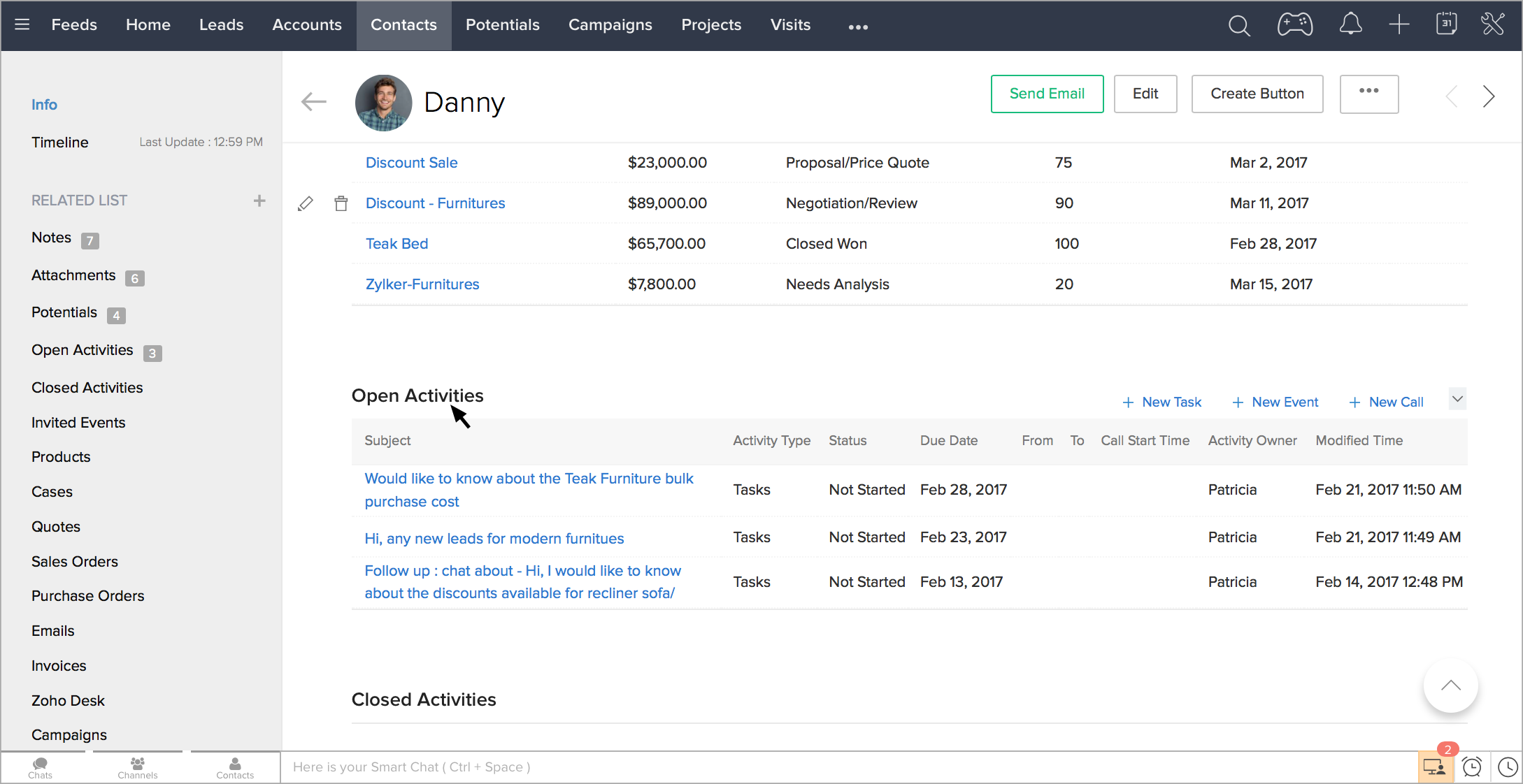 担当者のチャットウィンドウ内で、Zoho CRM内のすべての商談情報を表示できます。
