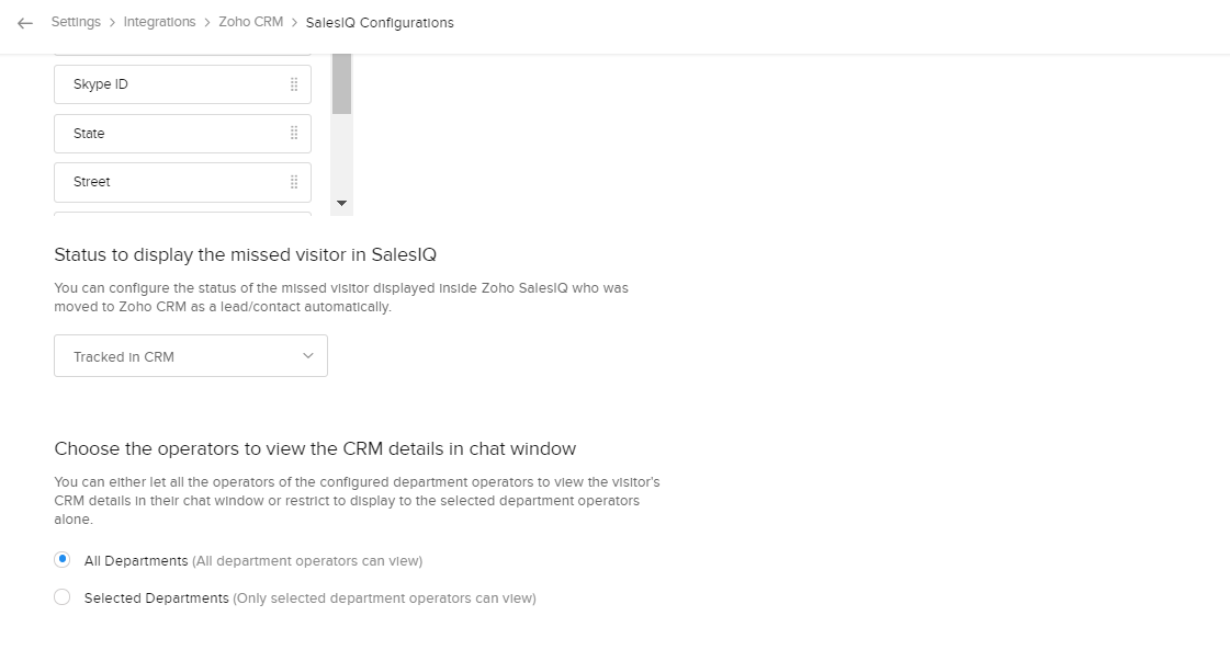 Zoho CRM内の訪問者に関する情報を表示可能な部門を選択できます。[すべて]を選択すると、設定した部門に関連付けられているすべての担当者がZoho CRMのデータを表示できるようになります。[カスタム]を選択すると、特定の部門を選択して、該当の部門に関連付けられている担当者のみがZoho CRMのデータを表示できるようになります。
