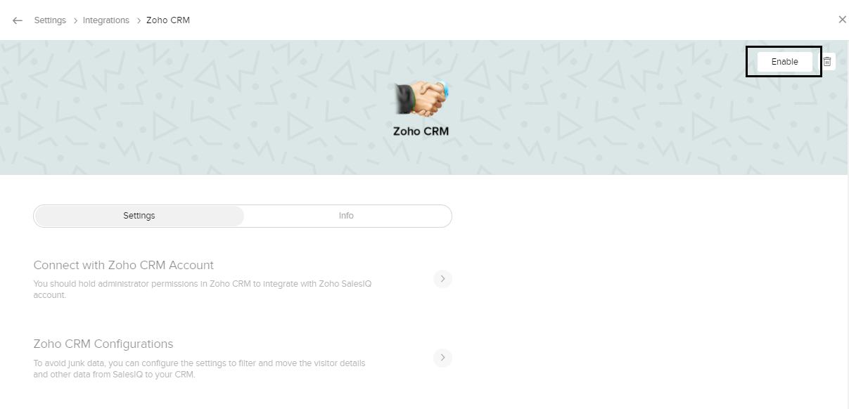 - Zoho CRM連携のページで、[有効にする]ボタンをクリックします。これにより、Zoho SalesIQアカウントが既存のZoho CRMアカウントに関連付けられます。また、Zoho CRMアカウントにおけるすべての権限がZoho SalesIQアカウントにも反映されます。設定に使用したアカウントのメールアドレスに基づいて連携が実行されますのでご注意ください。